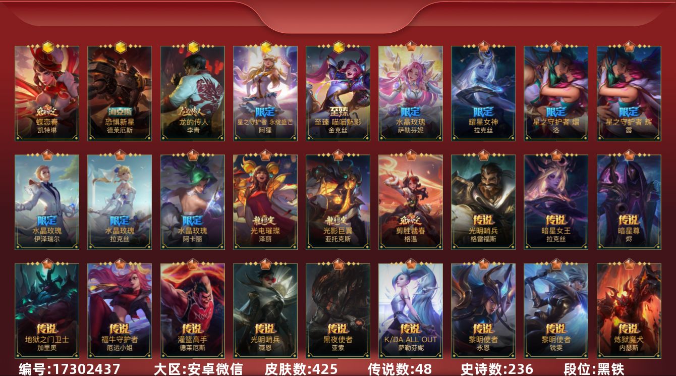 [17302437]有二次!6.8w收藏!425皮肤6神话48传说236史诗!满水晶玫瑰-至臻金克丝-海克斯洛手-满龙年-满兔年-满黑雾-满源计划-满混沌-满战斗学院-水晶花路家园卫士-探梦奇旅战斗纹章!,银鞍玉甲 嘉文四世,星之守护者 永绽盛芒 阿狸,至臻 喵喵魅影 金克丝,恐惧新星 德莱厄斯,蝶恋春 凯特琳,驯龙炮手 崔丝塔娜,光影巨翼 亚托克斯,光电璀璨 泽丽,源计划:毁灭 派克,水晶玫瑰 萨勒芬妮,心之钢 凯隐,霸天零式 赛恩,斗魂无双 亚索,日蚀骑士 蕾欧娜,跳跳倩影 厄运小姐,光明哨兵 格雷福斯,光明哨兵 薇恩,灌篮高手 德莱厄斯,黎明使者 永恩,耀星女神 拉克丝,暗星女王 拉克丝,星之守护者 落 霞,源计划:泯灭 雷克顿,源计划:林 易,炼狱魔犬 内瑟斯,剪胜裁春 格温,灵魂莲华 锤石,律政大亨 蒙多医生,西部天使 赛娜,月蚀骑士 蕾欧娜,地狱之门卫士 加里奥,天煞 劫,星之守护者 阿狸,神王 盖伦,水晶玫瑰 阿卡丽,神拳 李青,星之守护者 熠 洛,星之守护者 辉 霞,黎明使者 锐雯,黑夜使者 亚索,K/DA ALL OUT 萨勒芬妮,神龙尊者 驭风啸龙 易,战斗学院 伊泽瑞尔,神王 德莱厄斯,暗星尊 烬,水晶玫瑰 拉克丝,水晶玫瑰 伊泽瑞尔,源计划:联合 艾希,源计划:净化 薇恩,福牛守护者 厄运小姐,西部魔影 卢锡安