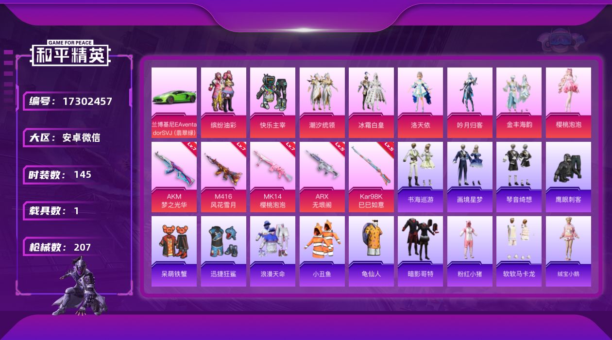 [17302457]【特价出售/店主推荐】安卓 微信-8粉装-6特效枪-1载具-2粉色飞行器-67849热力值-6王牌印记-145套装-207枪皮【热门品类】:粉装-缤纷油彩,套装-浪漫天命,套装-小丑鱼,套装-龟仙人,套装-暗影哥特,套装-粉红小猪,套装-软软马卡龙【粉色套装】:粉装-快乐主宰,粉装-缤纷油彩,粉装-潮汐统领,粉装-冰霜白皇,角色-洛天依,粉装-吟月归客,粉装-金丰海韵,角色-樱桃泡泡【粉色枪皮等级】:AKM-梦之光华(七级),M416-风花雪月(七级),ARX-无垠阁(五级),AKS-74U-森灵之息(五级),Kar98K-巳巳如意(五级),Mk14-樱桃泡泡(七级【粉色载具】:兰博基尼Aventador SVJ(翡翠绿)【粉色枪皮】:AKM-梦之光华,M416-风花雪月,ARX-无垠阁,AKS-74U-森灵之息,Kar98K-巳巳如意,Mk14-樱桃泡泡【粉色飞行器】:齐天大圣飞行器,凤舞九天飞行器