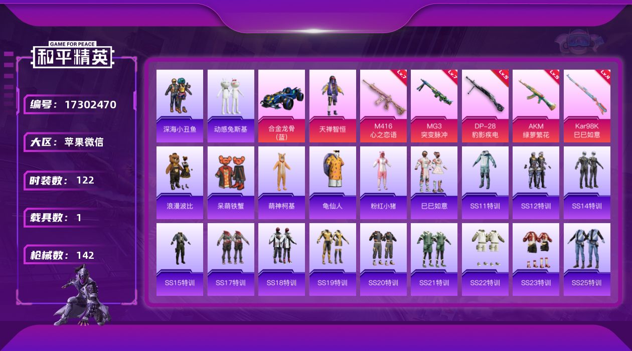 - [11523220]1红装 6粉装 4特效枪 16印记 可二次 可修改实名 优质装备:圣域龙灵-瑞拉,三级圣域龙灵-瑞拉(3级瑞拉),僚机-圣域龙宝,星之彼岸,DP-28-千金淑猫,七级DP-28-千金淑猫,萨利娅,Kar98K-圣域龙灵,凤凰座 一辉,Kar98K-巳巳如意 热门装扮:青空秋雨,鸢尾晶梦,金丰海韵 五级特效枪:五级Kar98K-巳巳如意 四级特效枪:四级DP-28-豹影疾电 三级特效枪:三级Kar98K-圣域龙灵 紫色装扮:田园牧歌,轻风白浪,SS22特训,和煦暖阳,飞狐塔尔斯,妙红点点,灵蜜圈圈,幻彩翩翩,SS23特训,俏皮奶喵,娇憨猪猪,萌趣咩咩,暖心熊熊,SS21特训,SS30特训套装,人气偶像,冷焰舞者,北国孤狼,SS20特训,SS31特训套装,雪绒豹,SS33特训套装,灵公主,快乐星愿,SS16特训,星梦畅游,SS13特训,SS14特训,SS19特训,电音精灵,SS17特训,SS18特训,坚韧舞者,长空猛禽,都市魅力,酒红色名流,野性战心,霓虹街区,青年教官,耀眼新星,荣耀,蓝彩潮人,蓝色守护者,蓝色运动,虎虎生威吉莉,街头潮人,跃动心情,龙的传人,飞行日记,骑行爱好者,魅力单车,鹤鸣,麻辣教官,黄色伏地魔,黄色名流,黄色运动,黎明保卫者,黑色伏地魔,龟仙人,冰河战士,龙魂突击队,蝶变,香桃花海,绮丽涂鸦,极速红龙,柠萌假日,格斗先锋,橘黑制服,沙漠兵团,活力之心,海岛探路者,涂山之恋,深蓝色名流,湖蓝色名流,幻世战舞者,完美偶像,帅气教官,幻影武者,怒火燎原,战地督导,探宝勇士,滨海假日,甜蜜熊情侣,白色伏地魔,破晓战魂,破蛋小黄鸡,王牌教练,福星高照,空岛之星,空投萌叽,竞技勇士朋克,竞技达人朋克,红色运动,甜蜜告白,猛禽,滨海厨神,灰色格斗者,灼焰舞者,炫蓝之夏,热血青春,牛气冲天,猎鹰,牛气满满,湖畔霞光,小熊娃娃,雏菊兔兔,萝兰蝴蝶,SS29特训,银尘,纯真浪花,热情海星,曼妙人鱼,SS28特训,迎夏光舞,星途旅人,巳巳如意,石蕴玉辉,鱼渊荷华,玉兔迎春,燕燕于飞,森林游猎者,青团波波,糖糖葫芦,棉花软糖,竞技名士,都市丽猫,摩登魅猫,街头风暴,智谋强哥,惊鸿侠骨,SS25特训,甜梦熊熊,神气柴柴,懵萌河马,SS24特训(SS24特训套装),锦衣飞扬,绝对偶像,金戈铁马,SS27特训,粉红小猪,SS26特训,新侠客行,SS12特训,耀粉歌者