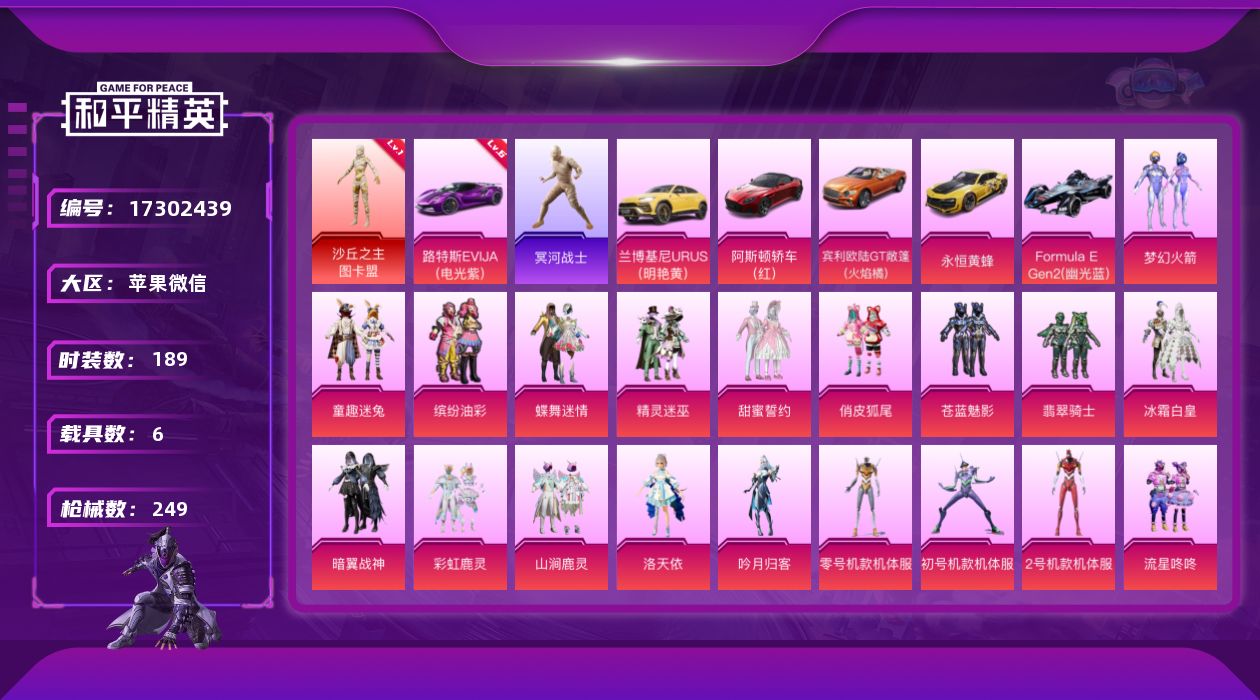 [17302439]【特价出售/店主推荐】苹果 微信-无敌战神框-1神装-26粉装-9特效枪-6载具-5粉色飞行器-100523热力值-9王牌印记-189套装-249枪皮