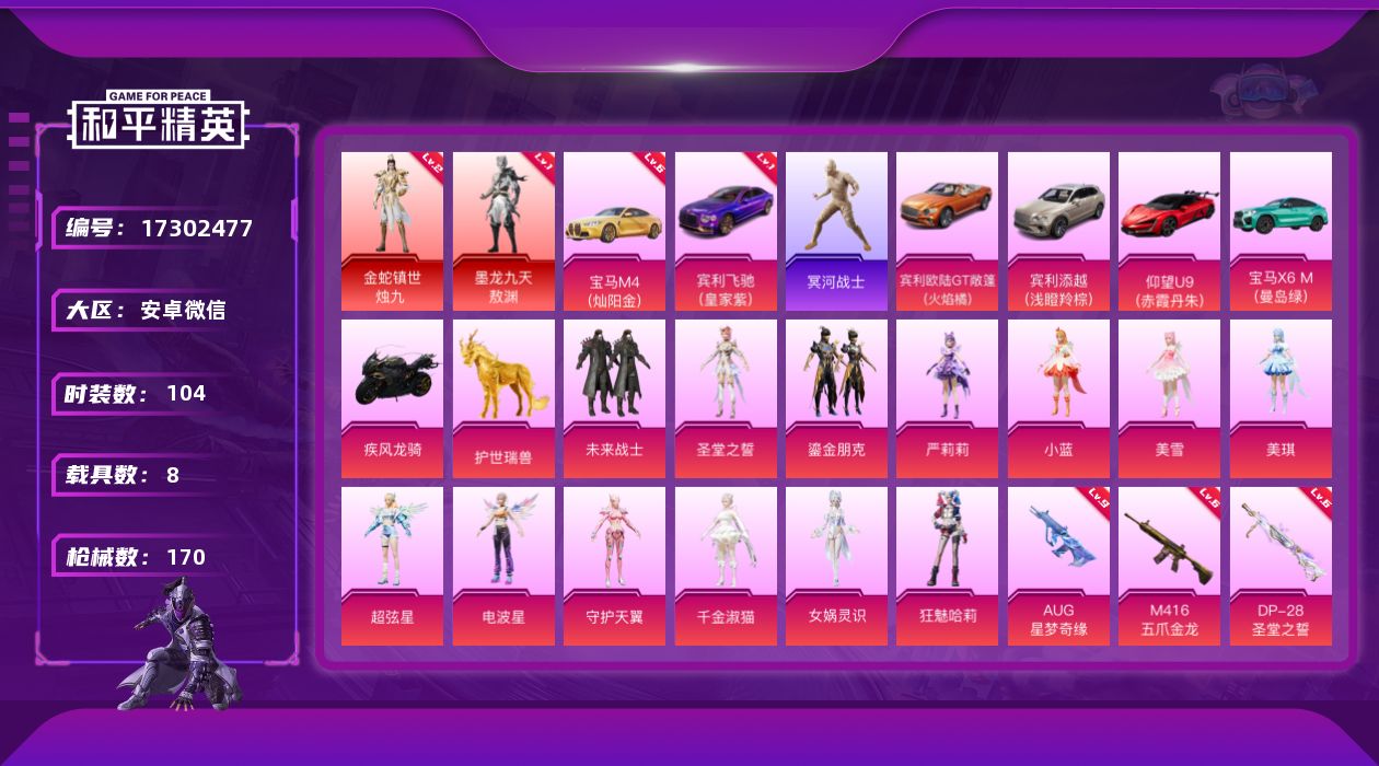 [17302477]满级宝马满级星梦奇缘【特价出售/店主推荐】安卓 微信-无敌战神框-2神装-14粉装-14特效枪-8载具-11粉色飞行器-82826热力值-12王牌印记-104套装-170枪皮