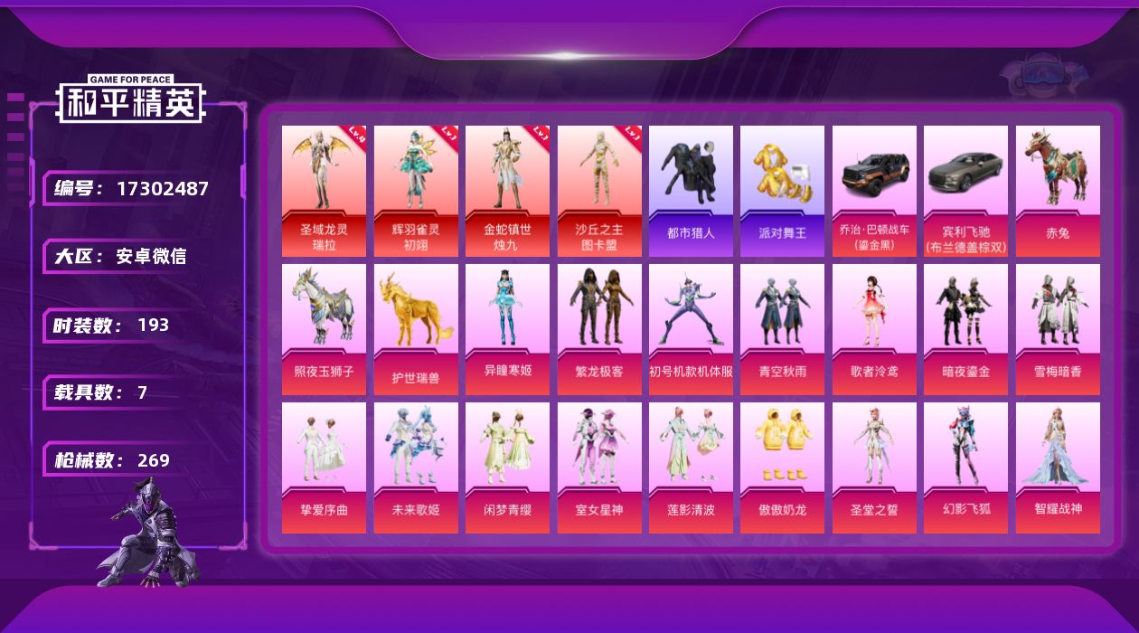 - [16327436]苹果 微信-1神装-3粉装-9特效枪-1载具-4粉色飞行器-41216热力值-4王牌印记-67套装-119枪皮【红色神装等级】:魔童闹海-哪吒(二级)【红色角色神装】:魔童闹海-哪吒【热门品类】:套装-龟仙人,角色-六号稻草人【粉色套装】:粉装-宝贝奶油派,粉装-天使彩虹糖,粉装-星穹咏叹调【粉色枪皮等级】:AKM-甜心宝贝(六级),SCAR-L-魔童闹海 哪吒(三级),M416-心之恋语(七级),AUG-圣斗士星矢(五级),M762-鬼刀(五级),Kar98K-巳巳如意(五级),Mk14-甜梦熊击(五级),DP-28-豹影疾电(四级),MG3-辉羽雀灵(三级)【粉色载具】:辉羽雀灵自行车【粉色枪皮】:AKM-甜心宝贝,SCAR-L-魔童闹海 哪吒,M416-心之恋语,AUG-圣斗士星矢,M762-鬼刀,Kar98K-巳巳如意,Mk14-甜梦熊击,DP-28-豹影疾电,MG3-辉羽雀灵【粉色飞行器】:雀灵庇佑飞行器,飞天猪飞行器