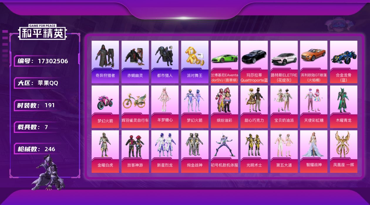 [17302506]苹果 手Q-无敌战神框-17粉装-12特效枪-7载具-12粉色飞行器-86202热力值-10王牌印记-191套装-246枪皮