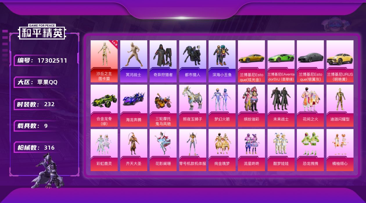 - [15261765]【店主推荐捡漏号!可直接换绑】/素材身法号 苹果 手Q-3神装-8粉装-7特效枪-2载具-5粉色飞行器-3.3w热力值-1王牌印记-47套装-80枪皮【红色神装等级】:灵猫魔法师-塞维尔(二级),辉羽雀灵-初翊(一级)【热门品类】:粉装-梦幻火箭【粉色载具】:僚机-圣域龙宝,黑曜夜骑,辉羽雀灵自行车【粉色套装】:粉装-梦幻火箭,角色-智耀战神,粉装-百变魔方,角色-幻海仙踪,粉装-星穹咏叹调,角色-狂魅哈莉,角色-绯月迷踪,角色-绯穹魔姬【粉色枪皮等级】:M416-灵猫魔法师(三级),AKS-74U-星穹咏叹调(六级),Kar98K-巳巳如意(三级),Kar98K-圣域龙灵(三级),AMR-智耀战神(三级),DP-28-豹影疾电(五级),MG3-辉羽雀灵(三级)【粉色飞行器】:圣域金龙飞行器,百变魔方飞行器,雀灵庇佑飞行器,灵猫魔法师飞行器,灵珠游龙飞行器