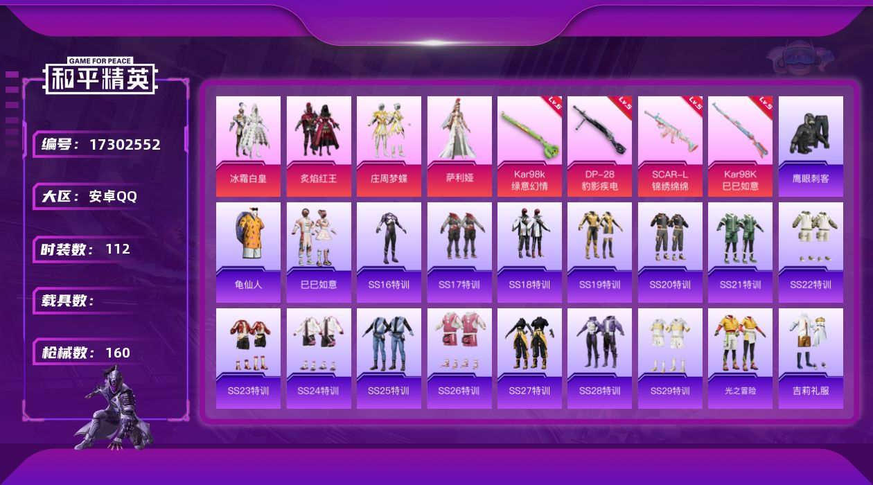 [17302552]安卓 手Q-4粉装-4特效枪-0载具-1粉色飞行器-41772热力值-11王牌印记-112套装-160枪皮 【热门品类】:套装-龟仙人 【粉色套装】:粉装-冰霜白皇,粉装-炙焰红王,粉装-庄周梦蝶,角色-萨利娅 【粉色枪皮等级】:SCAR-L-锦绣绵绵(五级),Kar98K-绿意幻情(六级),Kar98K-巳巳如意(五级),DP-28-豹影疾电(五级) 【粉色枪皮】:SCAR-L-锦绣绵绵,Kar98K-绿意幻情,Kar98K-巳巳如意,DP-28-豹影疾电 【粉色飞行器】:绝色倾城飞行器 【粉色降落伞】:恐龙拽拽降落伞,仲夏莫吉托降落伞,炫光之旅降落伞,蜜语绒猫降落伞,雪月幻音降落伞 【稀有套装】:套装-龟仙人,套装-巳巳如意 【稀有枪皮】:AKM-奇异狩猎者,AKM-彩虹符号,AKM-影袭,AKM-灼热熔岩,AKM-生命誓言,AKM-破晓战魂,AKM-萌趣颜团子,AKM-虎虎生威,AKM-霓虹街区,AKM-龙的传人,M16A4-幻世战舞者,M16A4-红色方程式,M16A4-蓝色火焰,SCAR-L-炫彩节奏,SCAR-L-玉兔迎春,SCAR-L-红色方程式,SCAR-L-黄金龙骨,SCAR-L-龙宫之主,M416-糯团青竹,M416-红色方程式,M416-绯红前夜,M416-蓝色火焰,GROZA-异彩先驱,GROZA-彩虹符号,GROZA-影袭,GROZA-恐龙拽拽,GROZA-治愈之星,GROZA-田园牧歌,AUG-天降萌叽,AUG-耀粉歌者,AUG-青春冒险家,QBZ-未来歌姬,QBZ-飞驰魅影,M762-天降萌叽,M762-烈焰拳霸,M762-瑞龙福将,Mk47-妙红点点,Mk47-炫光之旅,AC-VAL-天降萌叽,AC-VAL-魅影蝠王,蜜獾-垂柳戏鸭,蜜獾-天降萌叽,蜜獾-娇憨猪猪,UZI-天降萌叽,UZI-娇憨猪猪,UZI-影袭,UZI-炫彩节奏,UZI-红色方程式,UMP45-炫光之旅,UMP45-生命誓言,UMP45-蓝色火焰,UMP45-诡娃娃,UMP45-绒宝小鹅,Vector-彩虹符号,Vector-生命誓言,Vector-田园牧歌,汤姆逊-天降萌叽,汤姆逊-庄周梦蝶,汤姆逊-异彩先驱,汤姆逊-炫彩节奏,汤姆逊-耀粉歌者,MP5K-异彩先驱,P90-飞驰魅影,P90-巳巳如意,Kar98K-影袭,Kar98K-炫彩节奏,Kar98K-红色