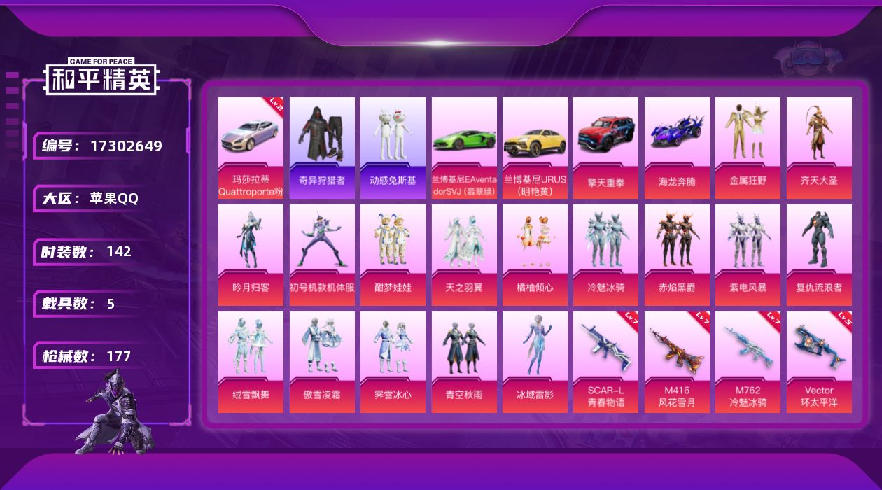 [17302649]【特价出售/店主推荐】苹果 手Q-16粉装-6特效枪-5载具-3粉色飞行器-69538热力值-10王牌印记-142套装-177枪皮【红色载具】:玛莎拉蒂Quattroporte(幻星粉)(二级)【热门品类】:套装-奇异狩猎者,角色-军刀雅典娜,套装-动感兔斯基人偶服,套装-粉红小猪【粉色套装】:粉装-金属狂野,粉装-齐天大圣,粉装-吟月归客,角色-初号机款机体服,粉装-酣梦娃娃,粉装-天之羽翼,粉装-橘柚倾心,粉装-冷魅冰骑,粉装-赤焰黑爵,粉装-紫电风暴,角色-复仇流浪者,粉装-绒雪飘舞,粉装-傲雪凌霜,粉装-霁雪冰心,粉装-青空秋雨,角色-冰域雷影【粉色枪皮等级】:M16A4-垂柳戏鸭(二级),SCAR-L-青春物语(七级),M416-风花雪月(七级),M762-冷魅冰骑(七级),Vector-环太平洋(五级),Kar98K-巳巳如意(二级)【粉色载具】:兰博基尼Aventador SVJ(翡翠绿),兰博基尼URUS(明艳黄),玛莎拉蒂Quattroporte(幻星粉),擎天重拳,海龙奔腾【粉色枪皮】:M16A4-垂柳戏鸭,SCAR-L-青春物语,M416-风花雪月,M762-冷魅冰骑,Vector-环太平洋,Kar98K-巳巳如意【粉色飞行器】:齐天大圣飞行器,天之羽翼飞行器,冠军兔兔飞行器
