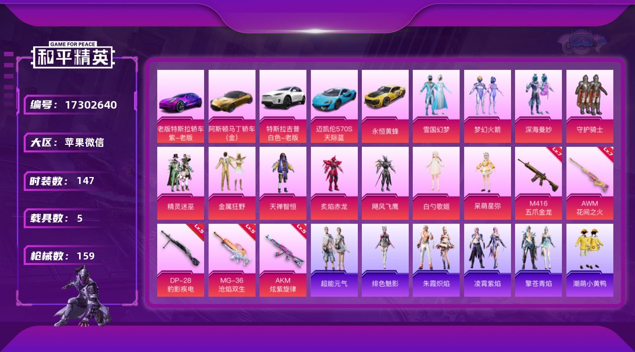 [17302640]【特价出售/店主推荐】苹果 微信-11粉装-5特效枪-5载具-5粉色飞行器-68936热力值-13王牌印记-147套装-159枪皮【热门品类】:粉装-雪国幻梦,粉装-梦幻火箭,套装-SS1特训,套装-潮萌小黄鸭,套装-浪漫波比【粉色套装】:粉装-深海曼妙,粉装-守护骑士,粉装-雪国幻梦,粉装-精灵迷巫,粉装-梦幻火箭,粉装-金属狂野,粉装-天禅智恒,粉装-炙焰赤龙,粉装-飓风飞鹰,角色-白勺歌姬,色-呆萌星弥【粉色枪皮等级】:AKM-炫紫旋律(五级),M416-五爪金龙(七级),AWM-花间之火(七级),DP-28-豹影疾电(五级),MG-36-沧焰双生(五级)【粉色载具】:特斯拉Model 3(奇幻紫),特斯拉Model X(珍珠白),阿斯顿马丁DBS(金),迈凯伦570S(天际蓝),永恒黄蜂【粉色枪皮】:AKM-炫紫旋律,M416-五爪金龙,AWM-花间之火,DP-28-豹影疾电,MG-36-沧焰双生【粉色飞行器】:春暖花开飞行器,梦幻火箭飞行器,伏魔团飞行器