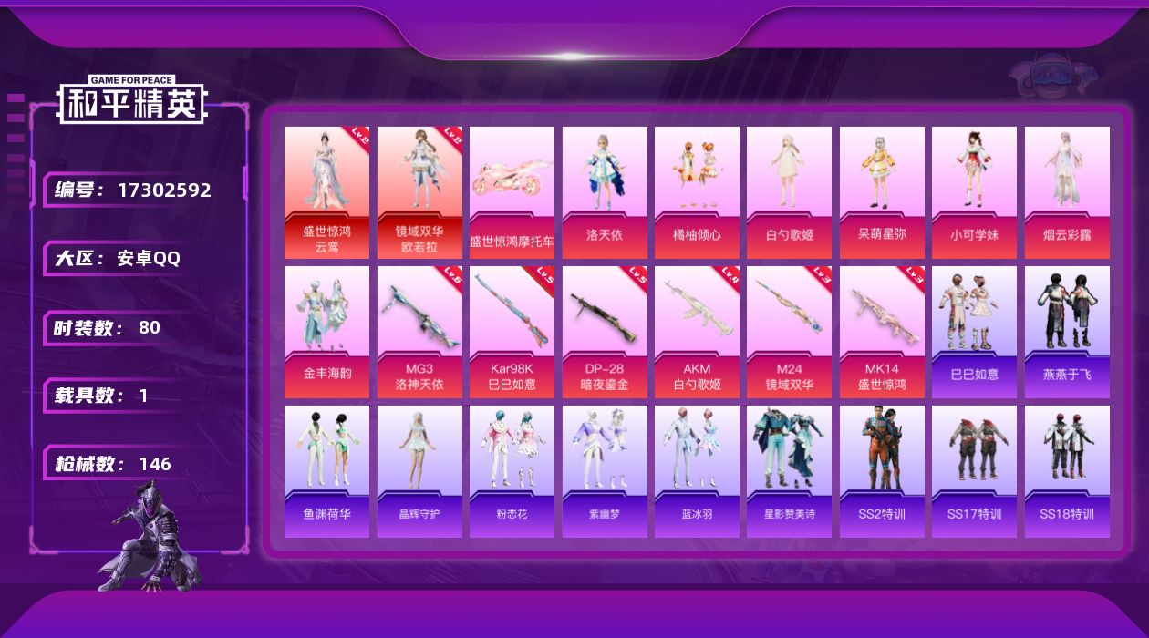 [17302592]【特价出售/店主推荐】安卓 手Q-2神装-7粉装-6特效枪-1载具-3粉色飞行器-5·1w热力值-1王牌印记-80套装-146枪皮 【红色神装等级】:盛世惊鸿-云鸾(二级),镜域双华-欧若拉(二级) 【红色角色神装】:盛世惊鸿-云鸾,镜域双华-欧若拉 【粉色套装】:角色-洛天依,粉装-橘柚倾心,角色-白勺歌姬,角色-呆萌星弥,角色-小可学妹,角色-烟云彩露,粉装-金丰海韵 【粉色枪皮等级】:AKM-白勺歌姬(四级),Kar98K-巳巳如意(五级),M24-镜域双华(三级),Mk14-盛世惊鸿(三级),DP-28-暗夜鎏金(五级),MG3-洛神天依(六级) 【粉色载具】:盛世惊鸿摩托车 【粉色枪皮】:AKM-白勺歌姬,Kar98K-巳巳如意,M24-镜域双华,Mk14-盛世惊鸿,DP-28-暗夜鎏金,MG3-洛神天依 【粉色飞行器】:炫彩糖果飞行器,镜域双华-灵镜之阶,凤舞九天飞行器 【粉色降落伞】:绝对恒星降落伞,绮梦青鸾降落伞,洛神天依降落伞,蓝莓炮弹降落伞,恐龙拽拽降落伞,彩虹甜喵降落伞,旋转彩虹降落伞,暗夜鎏金降落伞,白勺歌姬降落伞,镜域双华降落伞,江南烟雨降落伞,盛世惊鸿降落伞,星穹咏叹调降落伞,炫彩糖果降落伞 【稀有套装】:套装-巳巳如意,套装-燕燕于飞,套装-鱼渊荷华,套装-晶辉守护,套装-粉恋花,套装-紫幽梦,套装-蓝冰羽,套装-星影赞美诗 【稀有枪皮】:AUG-冰晶雪宝,AKM-彩虹符号,AKM-江南烟雨,AKM-破晓战魂,M16A4-红色方程式,M16A4-莲影清波,SCAR-L-炫彩节奏,SCAR-L-龙宫之主,M416-糯团青竹,M416-红色方程式,M416-蓝色火焰,GROZA-异彩先驱,GROZA-懵萌河马,GROZA-田园牧歌,AUG-天降萌叽,AUG-耀粉歌者,AUG-绝对恒星,QBZ-洛神天依,M762-天降萌叽,M762-瑞龙福将,Mk47-妙红点点,Mk47-洛神天依,G36C-镜域双华,G36C-懵萌河马,G36C-星穹咏叹调,AC-VAL-天降萌叽,AC-VAL-彩虹甜喵,蜜獾-娇憨猪猪,蜜獾-青瓷战姬,Famas-镜域双华,UZI-啾咪啾咪,UZI-天降萌叽,UZI-娇憨猪猪,UZI-炫彩节奏,UZI-盛世惊鸿,UMP45-夜灯,UMP45-生命誓言,Vector-焰鹰斗篷,Vector-田园牧歌,汤姆逊-异彩先驱,汤姆