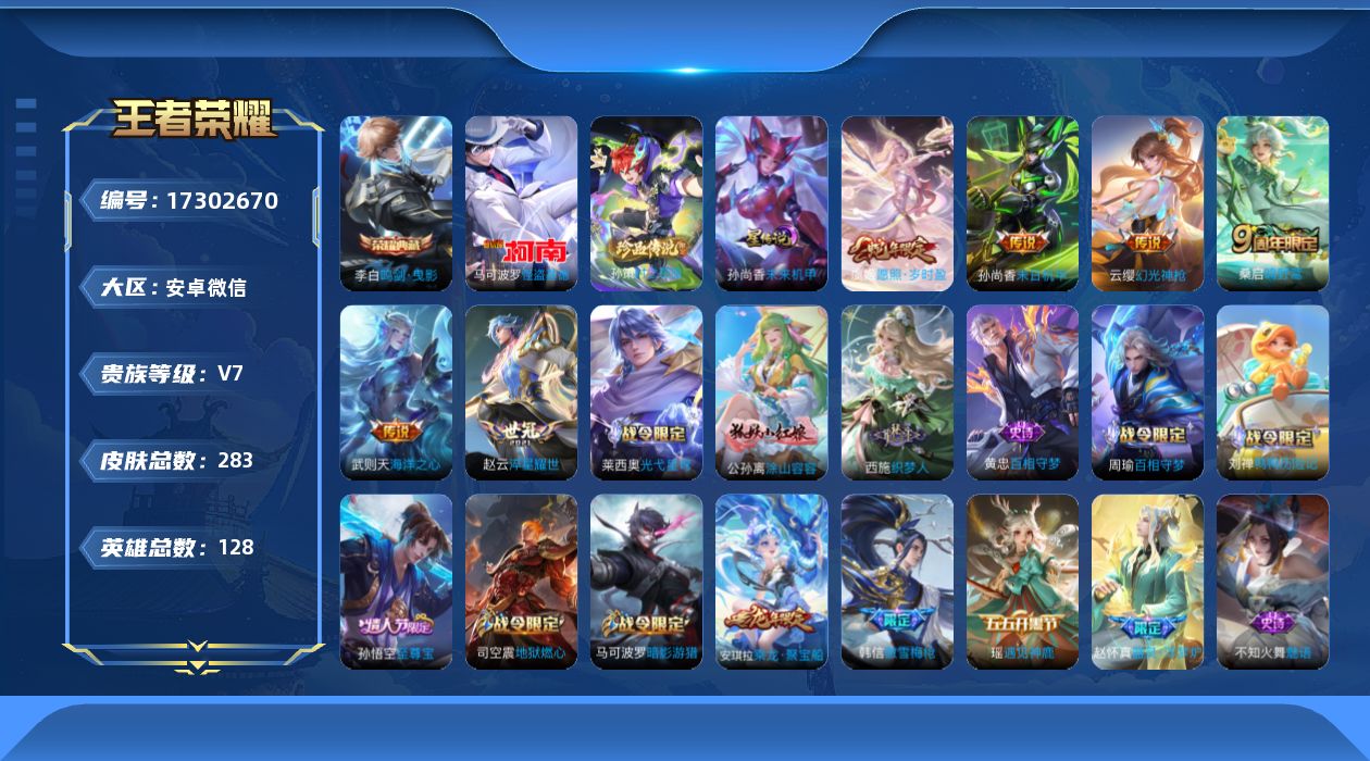 [17302670]安卓WX-V7-最强王者段位-128英雄-282皮肤-1典藏皮肤-1典藏英雄-2珍品传说-6传说-76史诗-1星传说