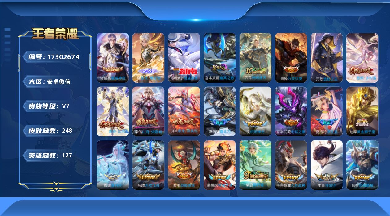 [17302674]微信社交限制,介意勿拍!安卓WX-V7-最强王者段位-127英雄-248皮肤-1典藏皮肤-1无双-1珍品传说-22传说-80史诗-2星传