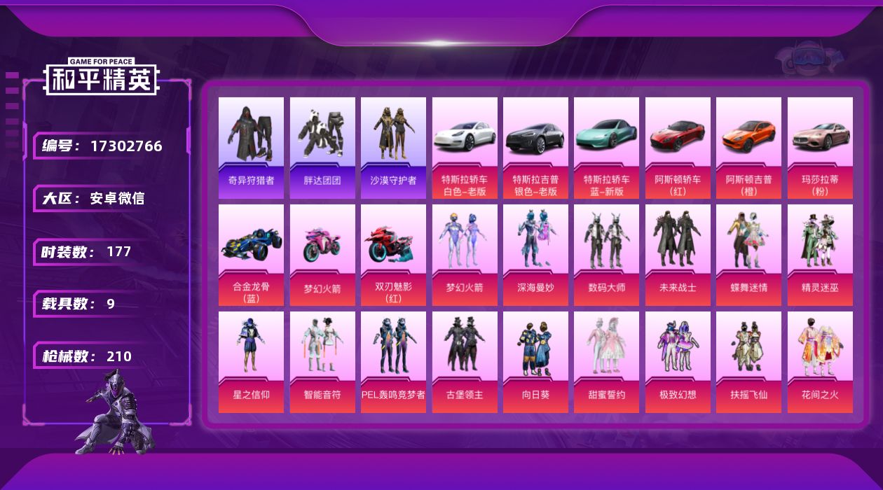 [17302766]【特价出售/店主推荐】安卓 微信-23粉装-14特效枪-9载具-18粉色飞行器-113837热力值-13王牌印记-177套装-210枪皮【热门品类】:粉装-梦幻火箭,套装-奇异狩猎者,套装-胖达团团,套装-沙漠守护者,套装-浪漫波比,套装-粉红小猪【粉色套装】:粉装-深海曼妙,粉装-数码大师,粉装-未来战士,粉装-蝶舞迷情,粉装-精灵迷巫,粉装-梦幻火箭,粉装-星之信仰,粉装-智能音符,粉装-PEL轰鸣竞梦者,粉装-古堡领主,粉装-向日葵,粉装-甜蜜誓约,粉装-极致幻想,粉装-扶摇飞仙,粉装-花间之火,粉装-诡面斩,粉装-锦绣火鲤,粉装-迷蝶贵族,粉装-绚金战神,粉装-银刃赛罗,粉装-冰霜白皇,粉装-炙焰红王,粉装-香水柠檬【粉色枪皮等级】:AKM-炫紫旋律(七级),SCAR-L-梦幻火箭(六级),SCAR-L-童趣迷兔(二级),M416-心之恋语(七级),GROZA-香水柠檬(四级),M762-甜蜜誓约(七级),M762-激战未来(四级),Kar98K-伏魔团(四级),Kar98K-巳巳如意(一级),M24-星之信仰(二级),AWM-花间之火(四级),SKS-诡面斩(二级),Mini14-荧光虫舞(二级),DP-28-扶摇飞仙(二级)【粉色载具】:特斯拉Model 3(珍珠白),特斯拉Model X(冷光银),特斯拉Roadster(水滴蓝),阿斯顿马丁DBS(红),阿斯顿马丁DBX(橙),玛莎拉蒂Ghibli(粉),合金龙骨(蓝),双人摩托-梦幻火箭,双人摩托-双刃魅影(红)【粉色枪皮】:AKM-炫紫旋律,SCAR-L-梦幻火箭,SCAR-L-童趣迷兔,M416-心之恋语,GROZA-香水柠檬,M762-甜蜜誓约,M762-激战未来,Kar98K-伏魔团,Kar98K-巳巳如意,M24-星之信仰,AWM-花间之火,SKS-诡面斩,Mini14-荧光虫舞,DP-28-扶摇飞仙【粉色飞行器】:深海曼妙飞行器,春暖花开飞行器,精灵迷巫飞行器,梦幻火箭飞行器,炫紫旋律飞行器,PEL轰鸣竞梦者飞行器,古堡领主飞行器,甜蜜誓约飞行器,心之恋语飞行翼,扶摇飞仙飞行器,潮汐统领飞行器,诡面斩飞行器,锦绣火鲤飞行器,终极赛罗飞行器,童趣迷兔飞行器,齐天大圣飞行器
