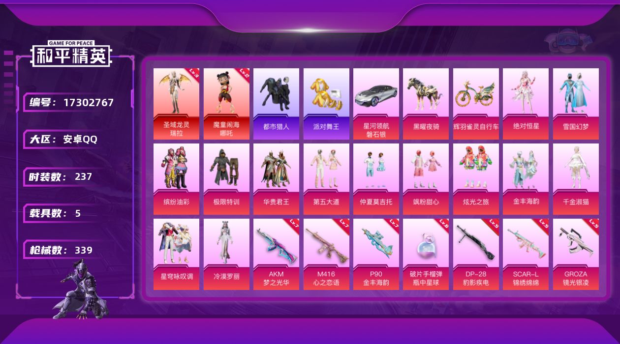 - [15210515]【1659】安卓 手Q-1神装-2粉装-4特效枪-1载具-2粉色飞行器-40390热力值-6王牌印记-97套装-130枪皮 【红色神装等级】:圣域龙灵-瑞拉(一级) 【红色角色神装】:圣域龙灵-瑞拉 【粉色套装】:角色-智耀战神,粉装-绯果甜心 【粉色枪皮等级】:Kar98K-圣域龙灵(一级),AWM-橘柚倾心(六级),AMR-智耀战神(四级),DP-28-豹影疾电(一级) 【粉色载具】:永恒黄蜂 【粉色枪皮】:Kar98K-圣域龙灵,AWM-橘柚倾心,AMR-智耀战神,DP-28-豹影疾电 【粉色飞行器】:圣域金龙飞行器,百变魔方飞行器 【粉色降落伞】:春暖花开降落伞,王牌四分卫降落伞,齐天大圣降落伞,橘柚倾心降落伞,闲梦青缨降落伞,圣域龙灵降落伞,智耀战神降落伞,星穹咏叹调降落伞,极意拳锋降落伞,炫彩糖果降落伞 【稀有套装】:套装-粉恋花,套装-紫幽梦,套装-蓝冰羽,角色-猎影月神,角色-瑰梦爱神,角色-鲛海歌灵,套装-星影赞美诗 【稀有枪皮】:AUG-冰晶雪宝,AKM-夜灯,AKM-彩虹符号,AKM-生命誓言,AKM-破晓战魂,AKM-萌趣颜团子,AKM-虎虎生威,AKM-霓虹街区,AKM-龙的传人,M16A4-幻世战舞者,M16A4-甜心亚梦,SCAR-L-夜灯,SCAR-L-炫彩节奏,SCAR-L-玉兔迎春,SCAR-L-红色方程式,M416-红色方程式,M416-绯红前夜,M416-蓝色火焰,GROZA-异彩先驱,GROZA-彩虹符号,GROZA-春暖花开,AUG-天降萌叽,AUG-耀粉歌者,QBZ-彩虹符号,QBZ-飞驰魅影,M762-牛气冲天,M762-瑞龙福将,AC-VAL-天降萌叽,AC-VAL-甜心亚梦,蜜獾-娇憨猪猪,UZI-天降萌叽,UZI-娇憨猪猪,UZI-影袭,UZI-炫彩节奏,UZI-红色方程式,UMP45-生命誓言,UMP45-蓝色火焰,Vector-生命誓言,Vector-百变魔方,汤姆逊-天降萌叽,汤姆逊-异彩先驱,汤姆逊-炫彩节奏,汤姆逊-智耀战神,MP5K-异彩先驱,P90-飞驰魅影,燃点复合弓-幻海仙踪,Kar98K-彩虹符号,Kar98K-欢乐麻酱,Kar98K-红色方程式,Kar98K-飞驰魅影,Kar98K-星穹咏叹调,M24-幻彩电音,SKS-夜灯,SKS-炫彩节奏,SKS-圣域龙灵,Mini14-异彩先驱,Mi