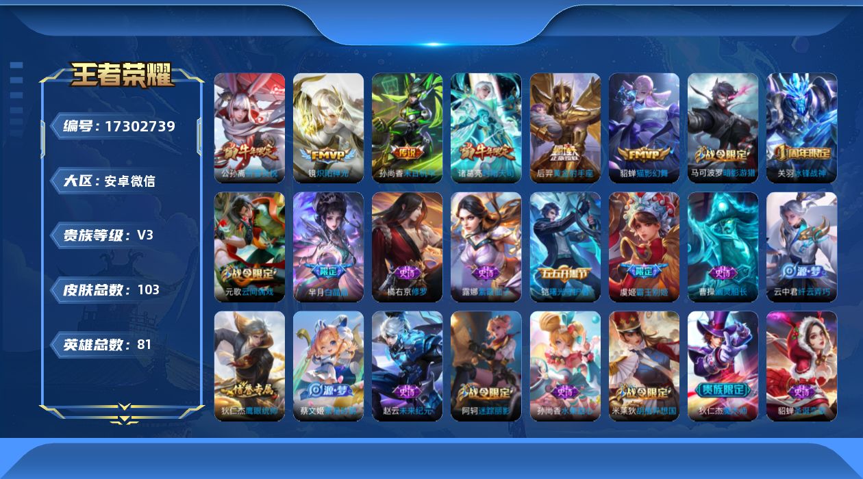 [17302739]社交限制 介意勿拍-不影响游戏/安卓WX-V3-荣耀黄金IV段位-81英雄-103皮肤-6传说-22史诗 【传说皮肤】:公孙离祈雪灵祝,诸葛亮时雨天司,镜炽阳神光,貂蝉猫影幻舞,后羿黄金射手座,孙尚香末日机甲 【限定皮肤】:狄仁杰阴阳师,赵云皇家上将,阿轲迷踪丽影,芈月白晶晶,元歌云间偶戏,马可波罗暗影游猎,狄仁杰魔术师,狄仁杰万华元夜,达摩星际陆战队,项羽海滩派对,老夫子醍醐杖,关羽冰锋战神,程咬金演武夺筹,刘邦夺宝奇兵,亚瑟潮玩骑士王,虞姬霸王别姬,钟馗驱傩正仪,雅典娜单词大作战,蔡文姬繁星吟游,鬼谷子原初探秘者,诸葛亮时雨天司,弈星混沌棋,公孙离祈雪灵祝,明世隐疑决卦,米莱狄胡桃异想国,云中君纤云弄巧,猪八戒西部大镖客,蒙犽狂想玩偶喵 【年限皮肤】:公孙离祈雪灵祝,诸葛亮时雨天司 【赛季限定】:弈星混沌棋,明世隐疑决卦,老夫子醍醐杖,鬼谷子原初探秘者,狄仁杰万华元夜,程咬金演武夺筹,钟馗驱傩正仪 【战令限定】:阿轲迷踪丽影,刘邦夺宝奇兵,马可波罗暗影游猎,猪八戒西部大镖客,蒙犽狂想玩偶喵,雅典娜单词大作战,元歌云间偶戏,亚瑟潮玩骑士王,米莱狄胡桃异想国,达摩星际陆战队 【史诗皮肤】:露娜紫霞仙子,赵云皇家上将,赵云未来纪元,貂蝉圣诞恋歌,狄仁杰魔术师,孙尚香水果甜心,妲己魅力维加斯,曹操幽灵船长,虞姬霸王别姬,关羽冰锋战神,铠曙光守护者,狄仁杰鹰眼统帅,蔡文姬繁星吟游,阿轲迷踪丽影,橘右京修罗,马可波罗暗影游猎,蒙犽狂想玩偶喵,云中君纤云弄巧,元歌云间偶戏,芈月白晶晶,米莱狄胡桃异想国,百里玄策热力回旋 【其他皮肤】:项羽海滩派对,韩信教廷特使,韩信街头霸王,露娜哥特玫瑰,赵云白执事,赵云忍炎影,芈月红桃皇后,安琪拉玩偶对对碰,典韦黄金武士,亚瑟死亡骑士,狄仁杰阴阳师,关羽龙腾万里,宫本武藏霸王丸,狂铁命运角斗场,老夫子功夫老勺,孙尚香沉稳之力,大乔守护之力,庄周奇妙博物学,小乔丁香结,弈星混沌棋,鲁班七号黑桃队长,明世隐疑决卦,刘邦夺宝奇兵,盾山圆桌骑士,老夫子醍醐杖,猪八戒西部大镖客,鬼谷子原初探秘者,雅典娜单词大作战,狄仁杰万华元夜,亚瑟潮玩骑士王,杨戬次元傲视,露娜瓷语鉴心,达摩星际陆战队,程咬金演武夺筹,张良缤纷绘卷,钟馗驱傩正仪,鲁班七号福禄兄弟,鲁班七号木偶奇遇记,高渐离金属狂潮,露娜绯红之刃,貂蝉异域舞娘,老夫子潮流仙人,曹操死神来了,张良一