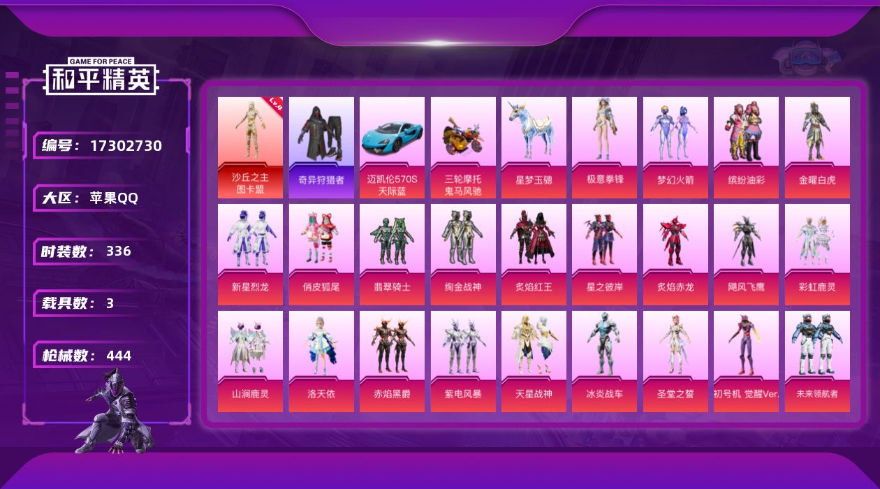 - PX_2089796- 苹果手Q-11王牌印记-有战神框-14粉装-16特效枪-4载具-81688热力值-178套装-228枪皮-7卓越印记-5传奇印记 【14粉装】,雪国幻梦,梦幻火箭,宝贝奶油派,放客神游,怪诞乔克,冷漠罗丽,智耀战神,荧海星豚,月影灵韵,海盐物语,牡丹亭·游园,幻情紫藤,吟月归客,音爆索尼克 【16特效枪】AKM-梦之光华-5级 SCAR-L-青春物语-7级 M416-心之恋