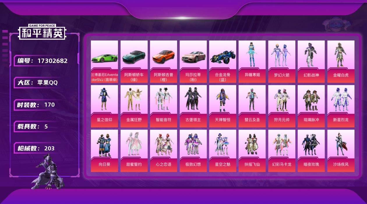 [17302682]【店主推荐捡漏号!可直接换绑】苹果 手Q-24粉装-10特效枪-5载具-9粉色飞行器-91526热力值-7王牌印记-170套装-203枪皮【热门品类】:粉装-梦幻火箭,套装-暗影哥特,套装-粉红小猪【粉色套装】:粉装-幻影战神,粉装-金曜白虎,粉装-梦幻火箭,粉装-星之信仰,粉装-金属狂野,粉装-智能音符,粉装-古堡领主,粉装-天禅智恒,粉装-彗云及圣,粉装-狩月元帅,粉装-琉璃脉冲,粉装-新星烈龙,粉装-向日葵,粉装-甜蜜誓约,粉装-心之恋语,粉装-极致幻想,粉装-星空之魅,粉装-扶摇飞仙,粉装-幻彩马卡龙,粉装-暗夜玫瑰,粉装-沙场疾风,粉装-俏雪含霜,粉装-吟月归客,角色-异瞳寒姬【粉色枪皮等级】:AKM-炫紫旋律(六级),SCAR-L-梦幻火箭(七级),M416-五爪金龙(一级),M416-心之恋语(一级),M416-风花雪月(七级),M762-甜蜜誓约(五级),Kar98K-伏魔团(四级),Kar98K-巳巳如意(五级),DP-28-扶摇飞仙(四级),DP-28-豹影疾电(五级)【粉色载具】:兰博基尼Aventador SVJ(翡翠绿),阿斯顿马丁DBS(绿),阿斯顿马丁DBX(橙),玛莎拉蒂Ghibli(粉),合金龙骨(蓝)【粉色枪皮】:AKM-炫紫旋律,SCAR-L-梦幻火箭,M416-五爪金龙,M416-心之恋语,M416-风花雪月,M762-甜蜜誓约,Kar98K-伏魔团,Kar98K-巳巳如意,DP-28-扶摇飞仙,DP-28-豹影疾电【粉色飞行器】:梦幻火箭飞行器,神秘黑猫飞行器,古堡领主飞行器,伏魔团飞行器,心之恋语飞行翼,扶摇飞仙飞行器,马卡龙飞行器,风花雪月飞行器