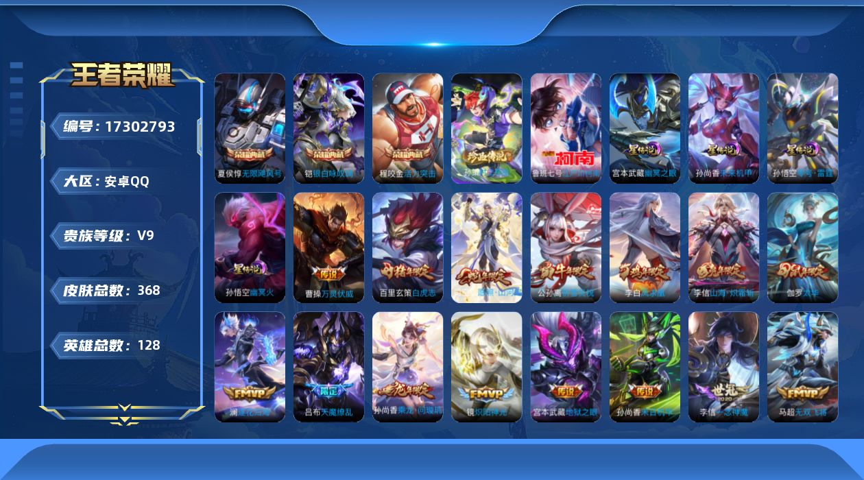 [17302793]【特价出售/店主推荐,打野35,段,对抗路32段,8市标】安卓Q-V9-至尊星耀I段位-128英雄-368皮肤-3典藏皮肤-5星传说-2珍品传说-31传说-114史诗 【英雄全皮】:孙权全皮,钟馗全皮,苍全皮,李信全皮,司空震全皮,空空儿全皮,影全皮 【荣耀典藏】:夏侯惇无限飓风号,程咬金活力突击,铠银白咏叹调 【珍品传说】:鲁班七号江户川柯南,孙策时之奇旅 【传说皮肤】:曹操万灵伏威,司空震愿照山河定,孙尚香乘龙问璇玑,赵云乘龙铭钟鼎,澜逐花归海,花木兰燃星之曲,李信山海炽霜斩,李白诗剑行,马超无双飞将,公孙离祈雪灵祝,诸葛亮时雨天司,铠绛天战甲,镜炽阳神光,虞姬启明星使,孙悟空零号赤焰,关羽武圣,李信一念神魔,刘备时之恋人,伽罗太华,貂蝉猫影幻舞,干将莫邪久胜战神,虞姬云霓雀翎,百里玄策白虎志,后羿黄金射手座,诸葛亮武陵仙君,李白凤求凰,孙尚香末日机甲,宫本武藏地狱之眼,孙悟空地狱火,吕布天魔缭乱,狄仁杰超时空战士 【限定皮肤】:狄仁杰阴阳师,赵云皇家上将,赵云龙胆,墨子神迹守卫,妲己时之彼端,嬴政优雅恋人,嬴政白昼王子,孙尚香蔷薇恋人,鲁班七号狮舞东方,庄周玄嵩,高渐离玩趣恶龙,阿轲迷踪丽影,钟无艳超时空战士,扁鹊奇幻香踪,芈月白晶晶,吕布天魔缭乱,吕布猎兽之王,吕布御风骁将,周瑜赤莲之焰,元歌云间偶戏,甄姬幽恒,甄姬落雪兰心,典韦蓝屏警告,典韦岱宗,马可波罗暗影游猎,马可波罗山海玄木吟,狄仁杰魔术师,狄仁杰万华元夜,达摩星际陆战队,达摩沙漠行僧,项羽海滩派对,项羽霸王别姬,老夫子航海奇遇记,关羽冰锋战神,关羽武圣,程咬金演武夺筹,刘邦夺宝奇兵,韩信飞衡,王昭君凤凰于飞,兰陵王驯魔猎人,兰陵王金庭之子,花木兰燃星之曲,亚瑟潮玩骑士王,孙悟空至尊宝,孙悟空零号赤焰,牛魔奔雷神使,后羿如梦令,李元芳银河之约,李元芳云中旅人,虞姬霸王别姬,虞姬启明星使,钟馗神迹守卫,钟馗驱傩正仪,杨戬潮玩骑兵,女娲朔望之晖,干将莫邪冰霜恋舞曲,雅典娜单词大作战,雅典娜黎明之约,蔡文姬繁星吟游,太乙真人华丽摇滚,鬼谷子五谷丰年,诸葛亮武陵仙君,诸葛亮时雨天司,黄忠火炮绅士,苏烈千军破阵,百里玄策白虎志,百里玄策原初追逐者,弈星混沌棋,梦奇顽趣,公孙离祈雪灵祝,沈梦溪星空之诺,沈梦溪大漠名商,裴擒虎李小龙,裴擒虎擒涛扼浪,米莱狄胡桃异想国,云中君纤云弄巧,李信山海炽霜斩,伽罗太华,猪
