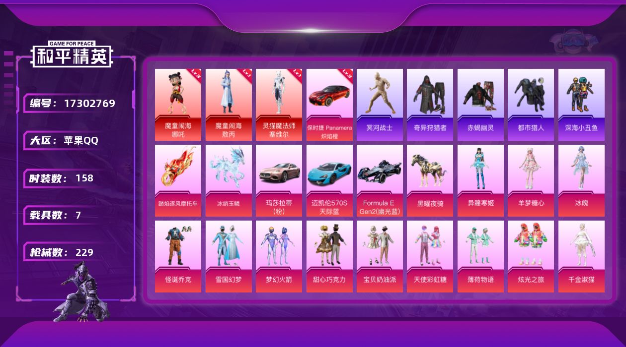 [17302769]【特价出售/店主推荐】苹果 手Q-无敌战神框-3神装-13粉装-12特效枪-7载具-8粉色飞行器-94284热力值-14王牌印记-158套装-229枪皮 【红色载具】:保时捷Panamera(炽焰橙)(三级) 【红色神装等级】:魔童闹海-敖丙(一级),魔童闹海-哪吒(三级),灵猫魔法师-塞维尔(一级) 【红色角色神装】:魔童闹海-敖丙,魔童闹海-哪吒,灵猫魔法师-塞维尔 【热门品类】:粉装-怪诞乔克,粉装-雪国幻梦,粉装-梦幻火箭,套装-赤蝎幽灵,套装-都市猎人,套装-冥河战士,套装-深海小丑鱼,套装-小丑鱼,套装-奇异狩猎者,套装-金羽特工,套装-龟仙人,套装-暗影哥特 【粉色套装】:粉装-怪诞乔克,粉装-甜心巧克力,粉装-宝贝奶油派,粉装-天使彩虹糖,粉装-雪国幻梦,粉装-梦幻火箭,粉装-薄荷物语,粉装-炫光之旅,角色-千金淑猫,粉装-星穹咏叹调,角色-冰魄,角色-羊梦糖心,角色-异瞳寒姬 【粉色枪皮等级】:AKM-炫紫旋律(七级),SCAR-L-魔童闹海 哪吒(三级),M416-心之恋语(七级),M416-灵猫魔法师(三级),蜜獾-异瞳寒姬(三级),AKS-74U-无垠阁(三级),P90-魔童闹海 敖丙(三级),Kar98K-巳巳如意(五级),DP-28-豹影疾电(五级),MG-36-沧焰双生(五级),平底锅-喜羊羊与灰太狼(三级) 【粉色载具】:玛莎拉蒂Ghibli(粉),迈凯伦570S(天际蓝),保时捷Panamera(炽焰橙),Formula E Gen2(幽光蓝),踏焰逐风摩托车,僚机-冰龙团团,黑曜夜骑,冰绡玉鳞 【粉色枪皮】:AKM-炫紫旋律,SCAR-L-魔童闹海 哪吒,M416-心之恋语,M416-灵猫魔法师,蜜獾-异瞳寒姬,AKS-74U-无垠阁,P90-魔童闹海 敖丙,Kar98K-巳巳如意,DP-28-豹影疾电,MG-36-沧焰双生,平底锅-喜羊羊与灰太狼,烟雾弹-猫咪绅士 【粉色飞行器】:星空武士飞行器,脆鲨七海飞行器,万象金身飞行器,灵猫魔法师飞行器,飞天猪飞行器,灵珠游龙飞行器 【粉色降落伞】:绝对恒星降落伞,甜心宝贝降落伞,梦幻火箭降落伞,星之彼岸降落伞,怪笑疯兔降落伞,青春物语降落伞,环太平洋降落伞,垂柳戏鸭降落伞,彩虹甜喵降落伞,第五大道降落伞,炫光之旅降落伞,莲影清波降落伞,繁龙极客降落伞,精灵梦叶罗丽降落伞,墨龙九天降落