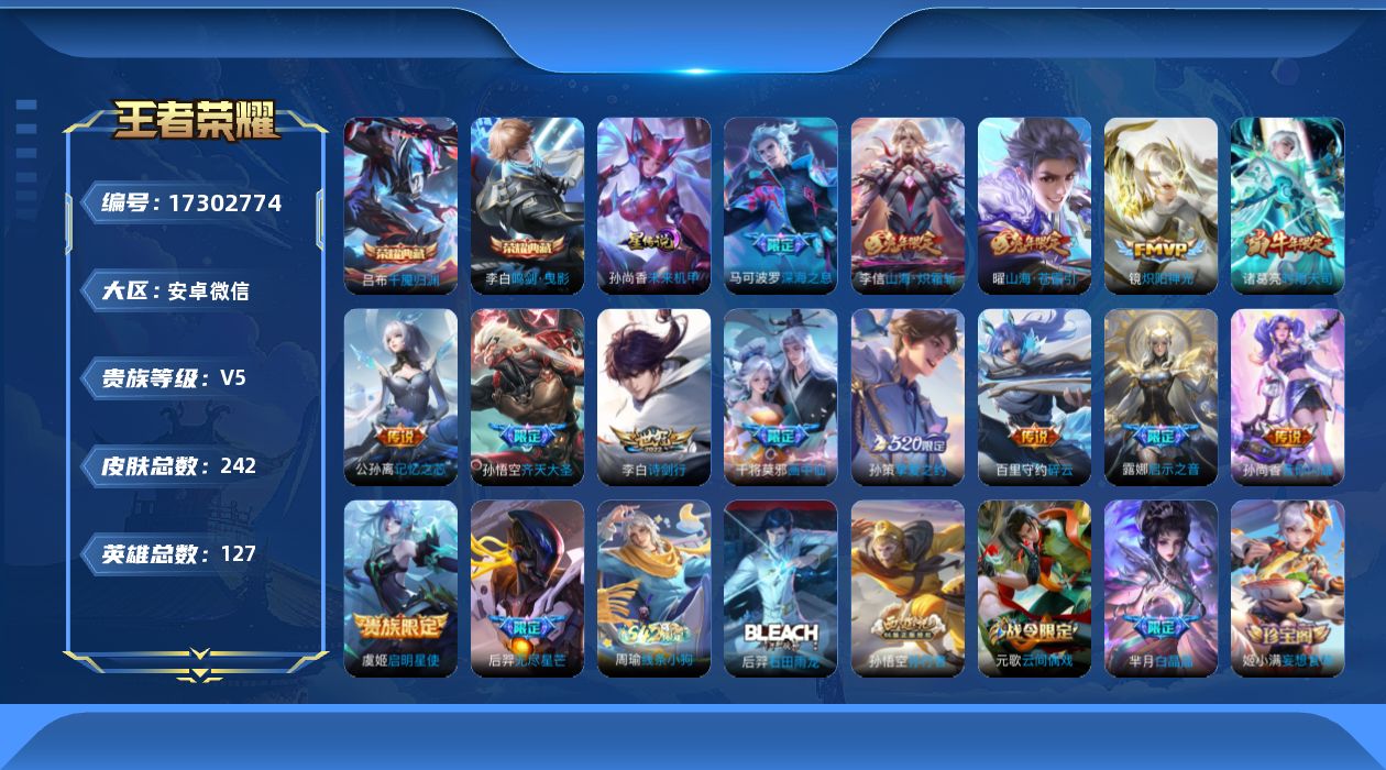 [17302774]安卓WX-V8-至尊星耀IV段位-127英雄-242皮肤-2典藏皮肤-1星传说-15传说-80史诗
