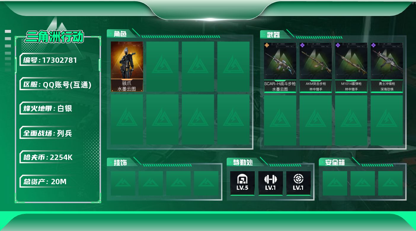 [17302781]【店主推荐捡漏号!可直接换绑】20m总资产-2254k哈伏币-23烽火等级-白银-10战场等级-列兵 【干员外观】:骇爪-水墨云图 【近战皮肤】:近战-黑鹰 【传说外观】:SCAR-H战斗步枪-水墨云图 【史诗外观】:AKM突击步枪-林中猎手,勇士冲锋枪-深海恐惧,M1014霰弹枪-林中猎手 【稀有外观】:ASh-12战斗步枪-星链科技,ASh-12战斗步枪-哈夫克航天,K416突击步枪-碳纤维,CAR15突击步枪-亚特兰蒂斯,P90冲锋枪-浅鲨小队,Vector冲锋枪-先锋,SMG-45冲锋枪-哈夫克卫队,SMG-45冲锋枪-幻影结构,MP7冲锋枪-幻影结构,M1014霰弹枪-幻影结构,G18-星链科技,G18-哈夫克航天 【普通外观】:M4A1突击步枪-粉色涂装,QBZ95-1突击步枪-高雅黑,QBZ95-1突击步枪-海浪,QBZ95-1突击步枪-海色,K416突击步枪-几何迷彩,K416突击步枪-高雅黑,AUG突击步枪-浅蓝涂装,M7战斗步枪-红色涂装,SCAR-H战斗步枪-数码迷彩,MP5冲锋枪-海色,Vector冲锋枪-几何迷彩,UZI冲锋枪-海色,QCQ171冲锋枪-三角洲力量,M1014霰弹枪-海浪,QJB201轻机枪-三角洲力量,沙漠之鹰-海浪,M1911-坚固材料 【军牌】:军牌-最后一刻,军牌-展示,军牌-永恒,军牌-神秘艺术,军牌-幸福国,军牌-信誉优秀 【挂饰】:挂饰-演出导演,挂饰-乐队纪念*3