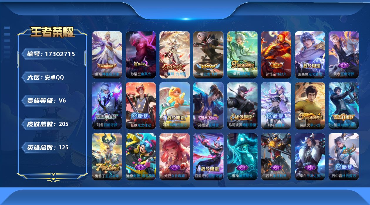[17302715]可二次【店主推荐捡漏号!可直接换绑】安卓Q-V6-至尊星耀I段位-125英雄-205皮肤-1典藏皮肤-4传说-40史诗