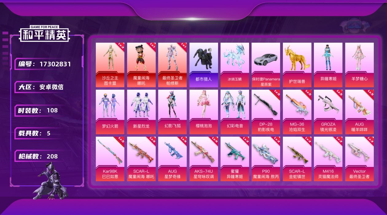 [17302831]【店主推荐捡漏号!可直接换绑】安卓 微信-4神装-8粉装-20特效枪-5载具-19粉色飞行器-80491热力值-7王牌印记-108套装-208枪皮【红色神装等级】:暮色玫影-艾丽娅(一级),魔童闹海-哪吒(一级),最终圣卫者-帕修斯(一级),沙丘之主-图卡盟(三级)【红色角色神装】:暮色玫影-艾丽娅,魔童闹海-哪吒,最终圣卫者-帕修斯,沙丘之主-图卡盟【热门品类】:粉装-梦幻火箭,套装-都市猎人,套装-小丑鱼【粉色套装】:粉装-梦幻火箭,粉装-新星烈龙,粉装-幻影飞狐,角色-樱桃泡泡,粉装-幻彩电音,角色-羊梦糖心,角色-异瞳寒姬,角色-罪夜之冕【粉色枪皮等级】:AKM-暮色玫影(三级),SCAR-L-金蛇镇世(三级),SCAR-L-魔童闹海 哪吒(四级),M416-灵猫魔法师(三级),GROZA-镜光银凌(五级),AUG-星梦奇缘(四级),AUG-暖羊咩咩(五级),蜜獾-异瞳寒姬(三级),UMP45-萌骑冒险(二级),Vector-最终圣卫者(三级),AKS-74U-星穹咏叹调(四级),AKS-74U-森灵之息(五级),P90-魔童闹海 敖丙(三级),Kar98K-巳巳如意(五级),Kar98K-圣域龙灵(三级),Mk14-福马献瑞(五级),DP-28-豹影疾电(五级),MG-36-沧焰双生(五级),平底锅-桃粉嫣然(一级),平底锅-喜羊羊与灰太狼(二级)【粉色载具】:保时捷Panamera(星辰紫),僚机-冰龙团团,护世瑞兽,冰绡玉鳞,暮色幽蹄【粉色枪皮】:AKM-暮色玫影,SCAR-L-金蛇镇世,SCAR-L-魔童闹海 哪吒,M416-灵猫魔法师,GROZA-镜光银凌,AUG-星梦奇缘,AUG-暖羊咩咩,蜜獾-异瞳寒姬,UMP45-萌骑冒险,Vector-最终圣卫者,AKS-74U-星穹咏叹调,AKS-74U-森灵之息,P90-魔童闹海 敖丙,Kar98K-巳巳如意,Kar98K-圣域龙灵,Mk14-福马献瑞,DP-28-豹影疾电,MG-36-沧焰双生,平底锅-桃粉嫣然,平底锅-喜羊羊与灰太狼【粉色飞行器】:酣梦熊熊飞行器,香车宝马飞行器,炫彩糖果飞行器,祥瑞起舞飞行器,沙丘之主天马,龙翔九天飞行器,幽焰列车飞行器,凤舞九天飞行器,万象金身飞行器,圣域金龙飞行器,百变魔方飞行器,雀灵庇佑飞行器,终晖之翼飞行器,飞天猪飞行器,灵珠游龙飞行器,暮色之舞飞行器,踏