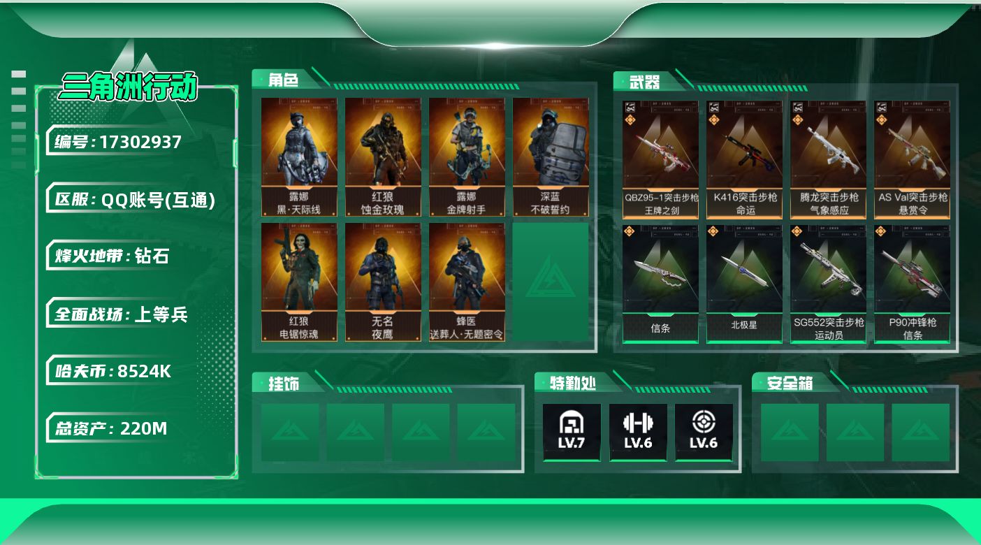 [17302937]4典藏枪皮全部优品s!【特价出售/店主推荐】220m总资产-8524k哈伏币-60烽火等级-钻石-50战场等级-上等兵 【干员外观】:红狼-蚀金玫瑰,露娜-黑·天际线,蜂医-送葬人·无题密令,无名-夜鹰,深蓝-不破誓约,红狼-电锯惊魂,露娜-金牌射手 【近战皮肤】:近战-北极星,近战-信条,近战-黑鹰 【典藏外观】:QBZ95-1突击步枪-王牌之剑,K416突击步枪-命运,腾龙突击步枪-气象感应,AS Val突击步枪-悬赏令 【传说外观】:M4A1突击步枪-蚀金玫瑰,M4A1突击步枪-阿米娅,ASh-12战斗步枪-鹅鸭杀,M16A4突击步枪-狩猎时刻,SG552突击步枪-运动员,AK-12突击步枪-夜鹰,AK-12突击步枪-特斯拉线圈,SCAR-H战斗步枪-水墨云图,SCAR-H战斗步枪-启航,G3战斗步枪-狩猎时刻,CAR-15突击步枪-阿米娅,K437突击步枪-北极星,KC17突击步枪-电锯惊魂,P90冲锋枪-信条,Vector冲锋枪-狩猎时刻,UZI冲锋枪-特斯拉线圈,SMG-45冲锋枪-骑士,SR-3M紧凑突击步枪-特斯拉线圈,勇士冲锋枪-能天使-午夜邮差,QCQ171冲锋枪-北极星,QCQ171冲锋枪-鹅鸭杀,725双管霰弹枪-送葬人-无题密令,M250通用机枪-骑士之心,QJB201轻机枪-鹅鸭杀,SR-25射手步枪-信条,PSG-1射手步枪-黑·天际线,复合弓-黑·天际线 【史诗外观】:AKM突击步枪-林中猎手,QBZ95-1突击步枪-曙光,ASh-12战斗步枪-守夜人,ASh-12战斗步枪-无极限,M16A4突击步枪-竞赛选手,AUG突击步枪-蝮蛇,M7战斗步枪-百步穿杨,SG552突击步枪-尖端治疗,SG552突击步枪-深海恐惧,SCAR-H战斗步枪-囚徒,G3战斗步枪-流沙送葬,AS Val突击步枪-尖端治疗,AS Val突击步枪-典狱官,AS Val突击步枪-百步穿杨,腾龙突击步枪-无垢,腾龙突击步枪-猎鳄行动,K437突击步枪-守护者,MP5冲锋枪-深海恐惧,MP5冲锋枪-青枳,MP5冲锋枪-战术竞备,MP5冲锋枪-竞技风,P90冲锋枪-暗影猎手,Vector冲锋枪-阿萨拉文明,Vector冲锋枪-猎鳄行动,Vector冲锋枪-百步穿杨,SR-3M紧凑突击步枪-荒野求生,SR-3M紧凑突击步枪-战术竞备,勇士冲锋枪-深海恐惧,勇士冲锋枪-工