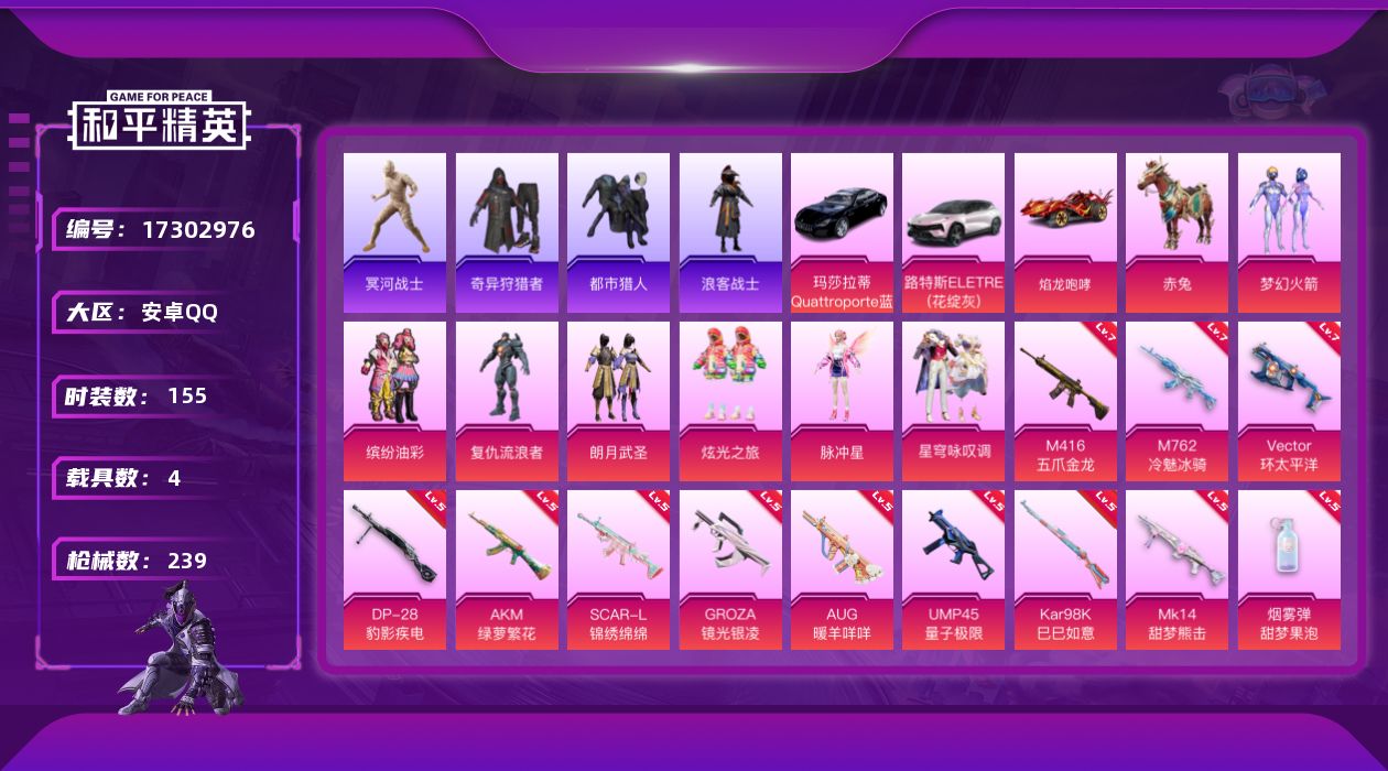 [17302976]安卓 手Q-7粉装-12特效枪-4载具-4粉色飞行器-80411热力值-12王牌印记-155套装-239枪皮
