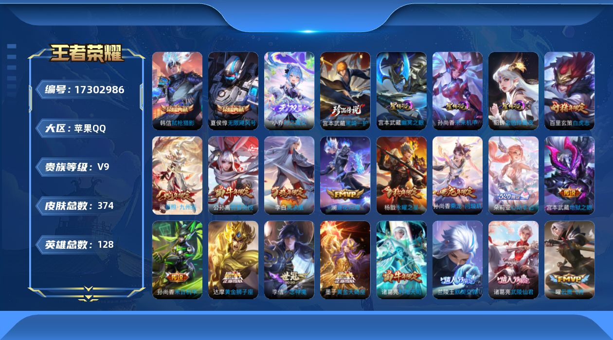 [17302986]苹果Q-V9-永恒钻石III段位-128英雄-374皮肤-2典藏皮肤-1无双-1珍品传说-33传说-3星元-111史诗