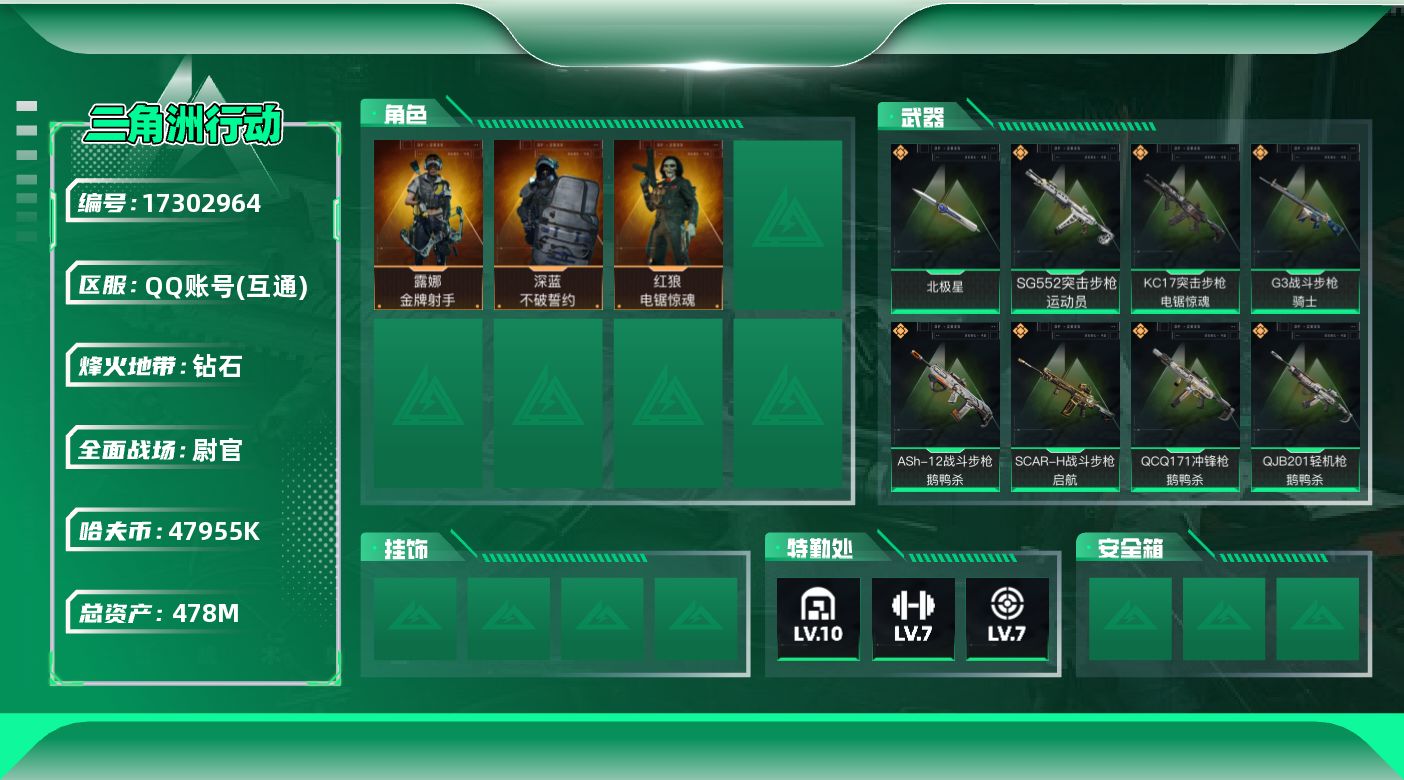 [17302964]478m总资产-47955k哈伏币-60烽火等级-钻石-50战场等级-尉官 【干员外观】:深蓝-不破誓约,红狼-电锯惊魂,露娜-金牌射手 【近战皮肤】:近战-北极星,近战-黑鹰 【传说外观】:M4A1突击步枪-阿米娅,ASh-12战斗步枪-鹅鸭杀,SG552突击步枪-运动员,AK-12突击步枪-创益工坊,SCAR-H战斗步枪-启航,G3战斗步枪-骑士,CAR-15突击步枪-阿米娅,腾龙突击步枪-捞点薯条,K437突击步枪-北极星,KC17突击步枪-电锯惊魂,Vector冲锋枪-能天使-午夜邮差,勇士冲锋枪-能天使-午夜邮差,QCQ171冲锋枪-北极星,QCQ171冲锋枪-鹅鸭杀,M250通用机枪-骑士之心,QJB201轻机枪-鹅鸭杀,M14射手步枪-电锯惊魂,AWM狙击步枪-捞点薯条,93R-捞点薯条 【史诗外观】:QBZ95-1突击步枪-曙光,ASh-12战斗步枪-无极限,K416突击步枪-冬日风情,AUG突击步枪-蝮蛇,M7战斗步枪-百步穿杨,SCAR-H战斗步枪-囚徒,G3战斗步枪-流沙送葬,PTR-32突击步枪-工业狂潮,AS Val突击步枪-典狱官,AS Val突击步枪-百步穿杨,K437突击步枪-守护者,MP5冲锋枪-深海恐惧,MP5冲锋枪-战术竞备,MP5冲锋枪-竞技风,Vector冲锋枪-百步穿杨,Vector冲锋枪-异域战争,SR-3M紧凑突击步枪-战术竞备,勇士冲锋枪-深海恐惧,勇士冲锋枪-工业狂潮,MP7冲锋枪-守护者,PKM通用机枪-蝮蛇,Mini-14射手步枪-守护者,M14射手步枪-工业狂潮,SV-98狙击步枪-林中猎手,SV-98狙击步枪-囚徒,M700狙击步枪-竞技风,M700狙击步枪-蝮蛇,M700狙击步枪-百步穿杨,M700狙击步枪-哈夫克警备,AWM狙击步枪-无极限,AWM狙击步枪-流沙送葬,沙漠之鹰-曙光,复合弓-守护者 【稀有外观】:M4A1突击步枪-繁盛,AKM突击步枪-战术演练,AKM突击步枪-肃杀,QBZ95-1突击步枪-公平竞技,ASh-12战斗步枪-精英联盟,ASh-12战斗步枪-繁盛,K416突击步枪-精英联盟,M16A4突击步枪-涂鸦艺术,AUG突击步枪-全金属外壳,AUG突击步枪-精英联盟,M7战斗步枪-精英联盟,M7战斗步枪-捣蛋鬼,SG552突击步枪-2026,SCAR-H战斗步枪-荣耀列队,SCAR-