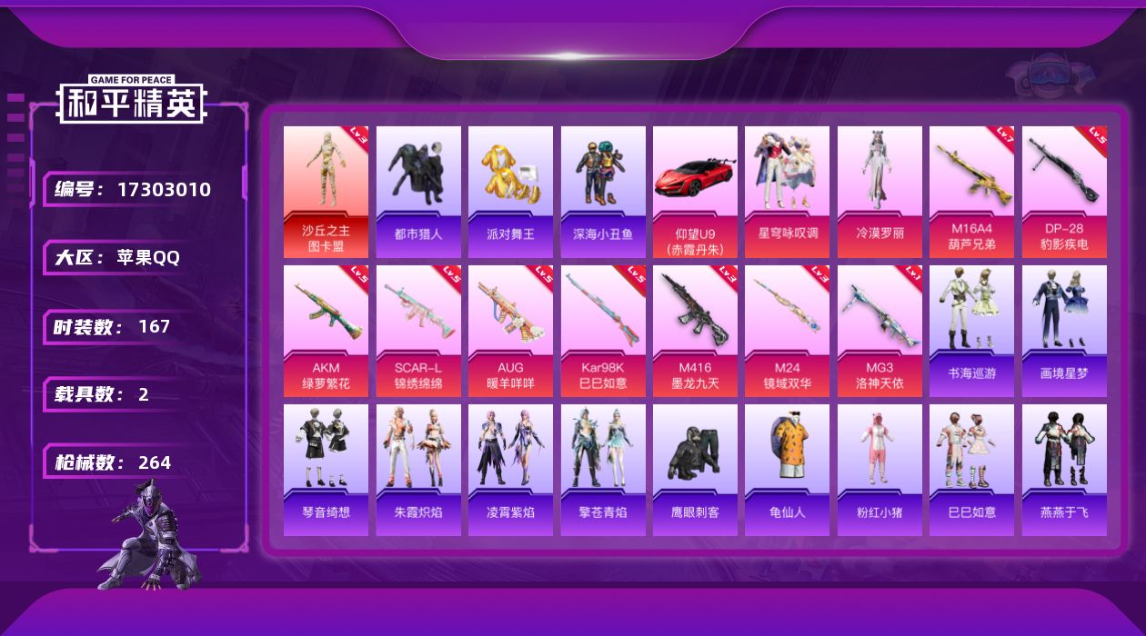 [17303010]苹果 手Q-1神装-3粉装-11特效枪-2载具-6粉色飞行器-79990热力值-21王牌印记-167套装-264枪皮