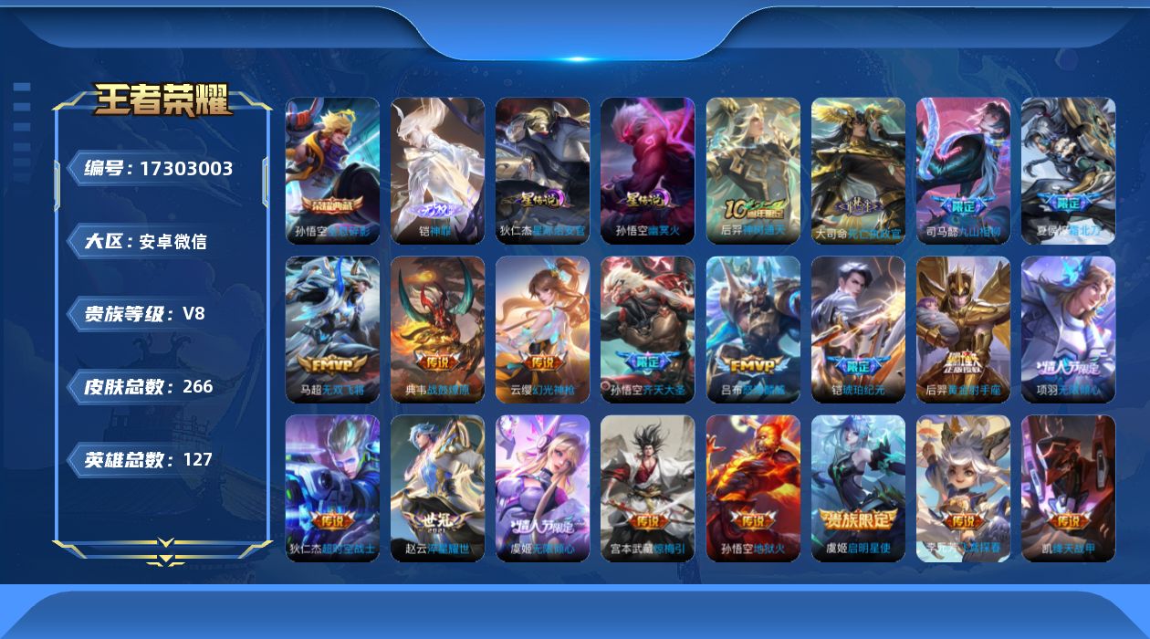[17303003]安卓WX-V8-最强王者段位-127英雄-266皮肤-1典藏皮肤-1无双-20传说-78史诗