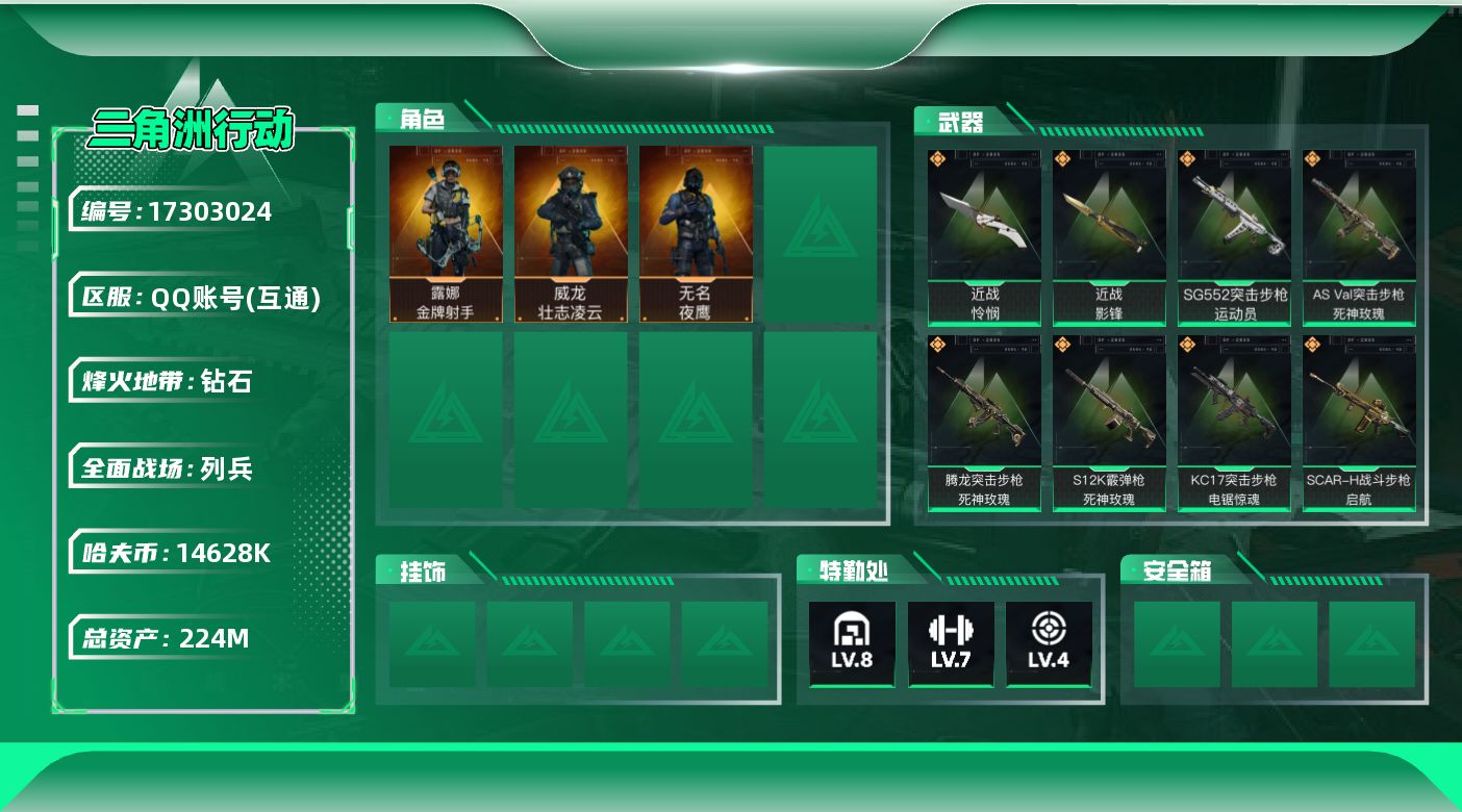 [17303024]【特价出售/店主推荐】224总资产-14628k哈伏币-60烽火等级-钻石-31战场等级-列兵 【干员外观】:威龙-壮志凌云,无名-夜鹰,露娜-金牌射手 【近战皮肤】:近战-影锋,近战-怜悯,近战-黑鹰 【传说外观】:M16A4突击步枪-狩猎时刻,SG552突击步枪-运动员,AK-12突击步枪-夜鹰,SCAR-H战斗步枪-铁艺苍穹,SCAR-H战斗步枪-水墨云图,SCAR-H战斗步枪-启航,G3战斗步枪-狩猎时刻,AS Val突击步枪-蛇年祥瑞,AS Val突击步枪-死神玫瑰,腾龙突击步枪-死神玫瑰,K437突击步枪-极速狂飙,KC17突击步枪-电锯惊魂,Vector冲锋枪-狩猎时刻,SMG-45冲锋枪-骑士,勇士冲锋枪-能天使-午夜邮差,M1014霰弹枪-影锋,S12K霰弹枪-死神玫瑰,M14射手步枪-电锯惊魂,SR-25射手步枪-水墨云图,AWM狙击步枪-影锋,复合弓-黑·天际线 【史诗外观】:M4A1突击步枪-特勤执行,AKM突击步枪-林中猎手,QBZ95-1突击步枪-曙光,QBZ95-1突击步枪-ACE,ASh-12战斗步枪-守夜人,K416突击步枪-冬日风情,M16A4突击步枪-竞赛选手,AUG突击步枪-战术迷彩,AUG突击步枪-蝮蛇,AUG突击步枪-特勤执行,M7战斗步枪-禁卫,M7战斗步枪-百步穿杨,SG552突击步枪-尖端治疗,SG552突击步枪-深海恐惧,SCAR-H战斗步枪-囚徒,G3战斗步枪-战场英杰,G3战斗步枪-流沙送葬,PTR-32突击步枪-ACE,AS Val突击步枪-尖端治疗,AS Val突击步枪-百步穿杨,MP5冲锋枪-深海恐惧,MP5冲锋枪-竞技风,Vector冲锋枪-阿萨拉文明,Vector冲锋枪-红色彗星,Vector冲锋枪-猎鳄行动,Vector冲锋枪-百步穿杨,SR-3M紧凑突击步枪-英雄,SR-3M紧凑突击步枪-战术竞备,勇士冲锋枪-深海恐惧,勇士冲锋枪-工业狂潮,QCQ171冲锋枪-禁卫,M1014霰弹枪-林中猎手,S12K霰弹枪-曙光,PKM通用机枪-蝮蛇,PKM通用机枪-守夜人,M250通用机枪-囚徒,SVD狙击步枪-暗夜猎手,M14射手步枪-禁卫,SKS射手步枪-ACE,SR-25射手步枪-尖端治疗,SV-98狙击步枪-林中猎手,SV-98狙击步枪-猎鳄行动,M700狙击步枪-竞技风,M700狙击步枪-蝮蛇,M