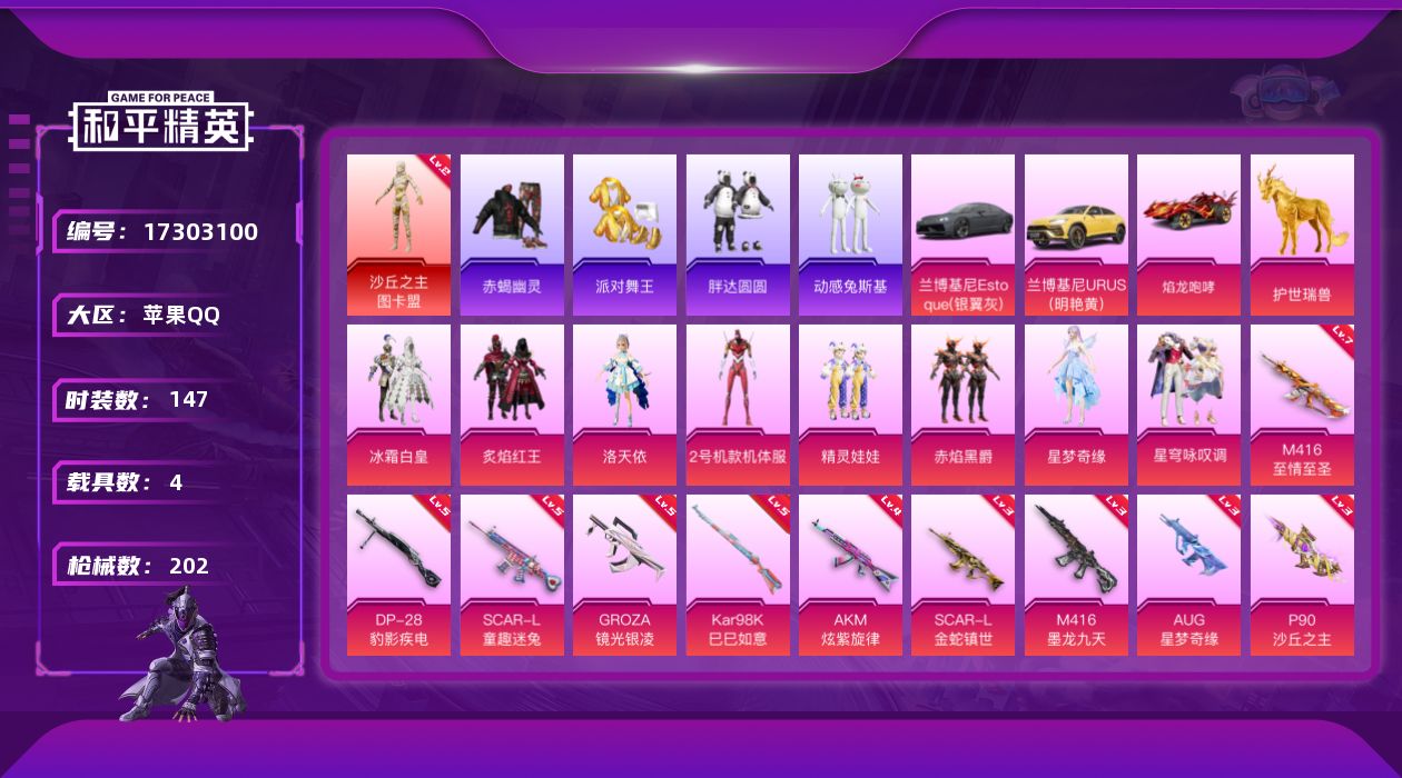 - [17098777]【11232194】[11232194]WBDS0055 苹果Q 历史无敌战神 217套装 303枪皮 1神装18粉装21特效枪3载具 沙丘之主-图卡盟 (2级) 木乃伊 红螳螂 M416-五爪金龙 (6级) 玛莎拉蒂粉色 合金龙骨绿色 护世瑞兽 奇异狩猎者 巡查衣 赤蝎幽灵 AKM-缤纷海域 AKM-百万伏特 都市猎人 派对舞王 派对舞王(金靴子) 梦幻火箭 雪国幻梦 猪猪侠 宝贝奶油派 天使彩虹糖 怪诞乔克 幻影战神 缤纷油彩 极限特训 第五大道 天禅智恒 绚金战神 冰霜白皇 星之彼岸 葫芦兄弟 复仇流浪者 碧影闪光 M416-超新星 (3级) P90-沙丘之主 (1级) AKM-甜心宝贝 (6级) AKM-炫紫旋律 (1级) UMP45-雪国精灵 (7级) Kar98K-巳巳如意 (5级) DP-28-豹影疾电 (5级) P90-能量风暴 (4级) MK12-雪月幻音 (1级) GROZA-香水柠檬 (5级) SCAR-L-童趣迷兔 (5级) AUG-星之彼岸 (6级) DP-28-圣堂之誓 (4级) M416-暖熊萌萌 (5级) M416-至情至圣 (2级) MG3-梦幻舞会 (4级) M16A4-葫芦兄弟 (4级) Vector-灵感创作师 (5级) 破片手榴弹-热量炸弹 (7级) 烟雾弹-丁香清露 (4级) 梦幻火箭飞行器 焰龙焚天飞行器 太空嘟嘟飞行器 龟仙人 东方飞龙 动感兔斯基 潮萌小黄鸭 恶魔人蛛 梦魇先生 呆萌铁蟹 万圣娃娃 鹰眼刺客 深海小丑鱼 浪漫波比 WBG追光队服 WBG战队服 暗影哥特 赛罗奥特曼 团圆交子 瑞龙福将 粉红小猪 忍者信条 水银刺客 狂沙舞者 漫步者 冰爽海盐 破蛋小黄鸡 弄潮海豚 M762-瑞龙福将 M24-香水柠檬 梦幻火箭头盔 雪国精灵头盔 甜心宝贝头盔 百万伏特头盔 幻影战神头盔 深海小丑鱼头盔 梦幻火箭背包 雪国精灵背包 甜心宝贝背包 百万伏特背包 幻影战神背包 深海小丑鱼背包