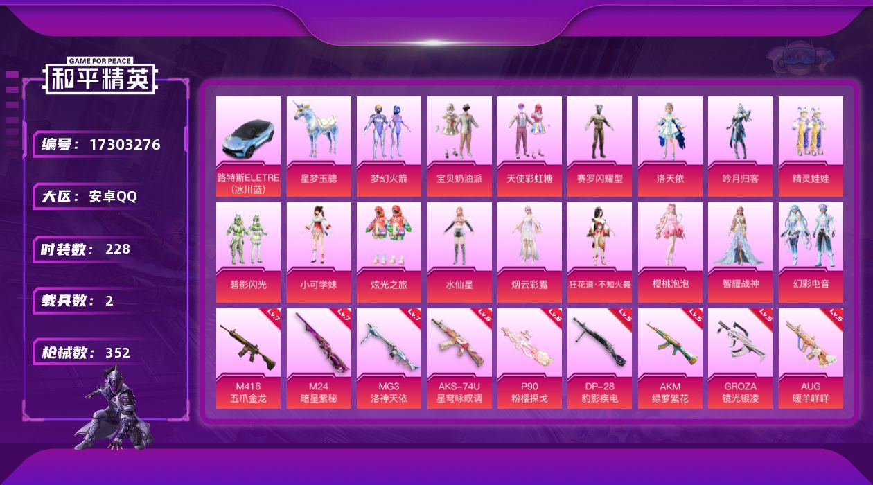 - [17870709]安卓 手Q-1粉装-6特效枪-0载具-2粉色飞行器-51088热力值-7王牌印记-125套装-169枪皮 【热门品类】:套装-浪漫天命,套装-都市猎人,套装-派对舞王,套装-深海小丑鱼,角色-8号机 【粉色套装】:角色-荧海星豚 【粉色枪皮等级】:SCAR-L-纯梦嫁纱(七级),M416-超新星(三级),M416-电玩时刻(五级),UMP45-萌骑冒险(五级),Kar98K-巳巳如意(五级),DP-28-豹影疾电(五级) 【粉色枪皮】:SCAR-L-纯梦嫁纱,M416-超新星,M416-电玩时刻,UMP45-萌骑冒险,Kar98K-巳巳如意,DP-28-豹影疾电 【粉色飞行器】:炫彩糖果飞行器,星夜魔法师飞行翼 【粉色降落伞】:绝对恒星降落伞,梦幻火箭降落伞,星之彼岸降落伞,暗夜鎏金降落伞,精灵梦叶罗丽降落伞,晶梦幻蝶降落伞,星穹咏叹调降落伞,喜羊羊与灰太狼降落伞,炫彩糖果降落伞 【稀有套装】:角色-甜心蒙太奇,套装-雪国风尚,套装-炫彩糖果,套装-糖糖葫芦,套装-青团波波,套装-黑曜寓言,套装-燕燕于飞,套装-鱼渊荷华,角色-海琴烟,套装-晶灵使者,套装-晶辉守护,套装-粉恋花,套装-紫幽梦,套装-蓝冰羽,套装-彩虹兔,套装-云朵鹅,套装-雪绒豹,角色-乐音,套装-蜜露汐语,套装-朱霞炽焰,套装-凌霄紫焰,套装-擎苍青焰,玩偶服-喜羊羊,套装-书海巡游,套装-画境星梦,套装-琴音绮想,套装-雨过天青,套装-红釉青花 【稀有枪皮】:AUG-冰晶雪宝,AKM-彩虹符号,AKM-影袭,AKM-灼热熔岩,AKM-破晓战魂,AKM-缤纷海域,M16A4-幻世战舞者,SCAR-L-玉兔迎春,M416-蓝色火焰,GROZA-影袭,GROZA-田园牧歌,GROZA-紫翼圣骑,AUG-天降萌叽,AUG-甜蜜菠萝,AUG-耀粉歌者,QBZ-飞驰魅影,M762-天降萌叽,M762-奇异狩猎者,M762-云朵鹅,蜜獾-天降萌叽,蜜獾-娇憨猪猪,ACE32-画境星梦,ARX-凌霄紫焰,UZI-啾咪啾咪,UZI-天降萌叽,UZI-娇憨猪猪,UZI-影袭,UZI-幻影飞狐,UMP45-生命誓言,UMP45-极意拳锋,Vector-田园牧歌,汤姆逊-天降萌叽,汤姆逊-像素花束,MP5K-画境星梦,AKS-74U-鬼刀,JS9-凌霄紫焰,P90-飞驰魅影,Kar98K-影袭,Kar98K-炫彩节