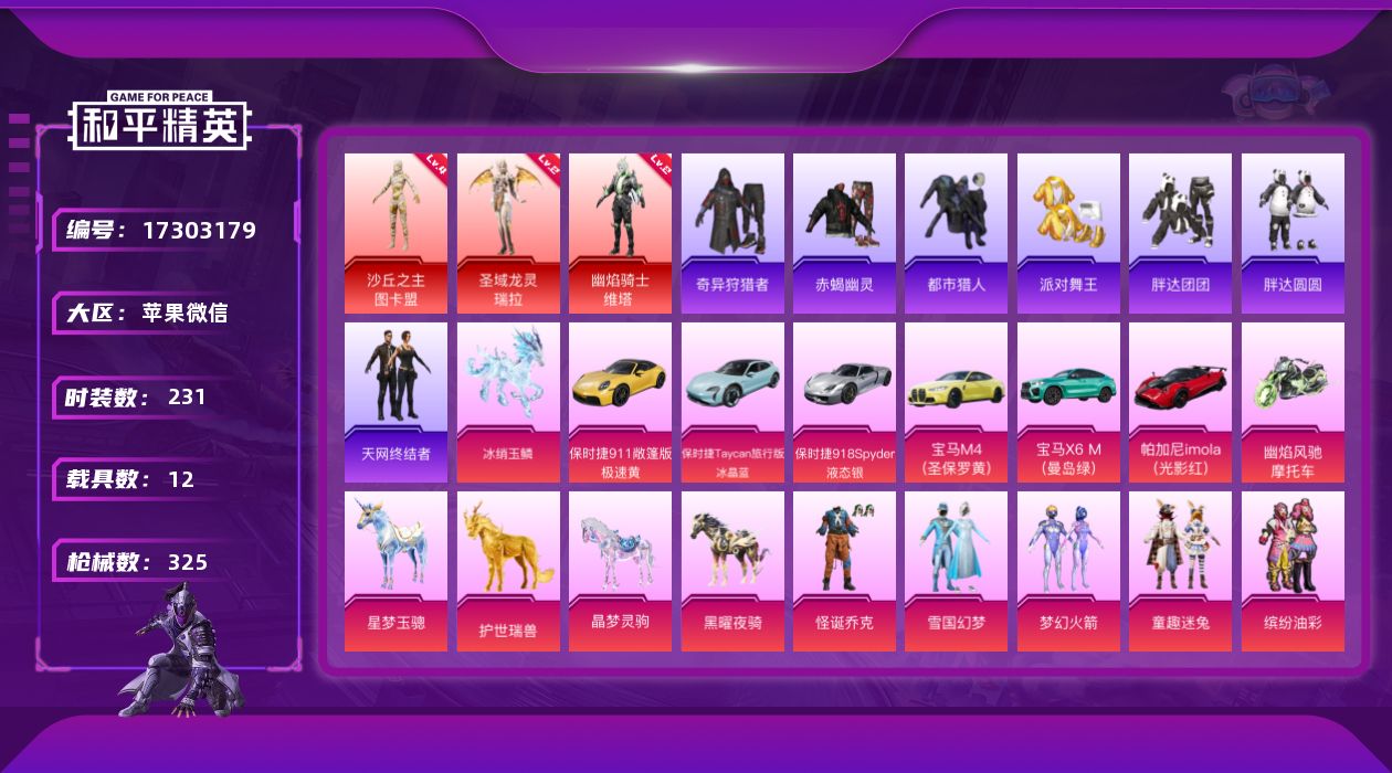 [17303179]6级aug 满级m4灵猫 【特价出售/店主推荐】苹果 微信-无敌战神框-3神装-27粉装-24特效枪-12载具-17粉色飞行器-138933热力值-11王牌印记-231套装-325枪皮 【红色神装等级】:圣域龙灵-瑞拉(二级),幽焰骑士-维塔(二级),沙丘之主-图卡盟(四级) 【红色角色神装】:圣域龙灵-瑞拉,幽焰骑士-维塔,沙丘之主-图卡盟 【热门品类】:粉装-怪诞乔克,粉装-雪国幻梦,粉装-梦幻火箭,粉装-童趣迷兔,粉装-缤纷油彩,套装-浪漫天命,套装-赤蝎幽灵,套装-都市猎人,套装-派对舞王,套装-小丑鱼,套装-奇异狩猎者,套装-胖达团团,套装-胖达圆圆,套装-天网终结者,角色-忠真马岱,套装-暗夜之虎,套装-暗影哥特,角色-8号机,角色-Mark.06,角色-六号稻草人,套装-红熊茄茄 【粉色套装】:粉装-极限特训,粉装-怪诞乔克,粉装-甜心巧克力,粉装-宝贝奶油派,粉装-天使彩虹糖,粉装-雪国幻梦,粉装-蝶舞迷情,粉装-梦幻火箭,粉装-缤纷油彩,粉装-冰霜白皇,粉装-童趣迷兔,角色-闪耀迪迦,角色-赛罗闪耀型,粉装-橘柚倾心,粉装-赤焰黑爵,粉装-暖熊萌萌,粉装-未来歌姬,角色-圣堂之誓,粉装-未来领航者,角色-千金淑猫,角色-晶梦幻蝶,角色-翎光蝶翼,粉装-桃粉嫣然,粉装-星月云朵,粉装-星穹咏叹调,角色-荧海星豚,角色-奇迹舞步 美雪 【粉色枪皮等级】:AKM-幽焰骑士(三级),SCAR-L-锦绣绵绵(五级),SCAR-L-金蛇镇世(三级),SCAR-L-魔童闹海 哪吒(三级),M416-五爪金龙(一级),M416-墨龙九天(三级),M416-灵猫魔法师(九级),GROZA-镜光银凌(五级),AUG-超新星(一级),AUG-星梦奇缘(六级),汤姆逊-星月云朵(四级),P90-沙丘之主(三级),Kar98K-巳巳如意(五级),Kar98K-圣域龙灵(三级),M24-镜域双华(三级),Mk14-福马献瑞(五级),DP-28-千金淑猫(一级),DP-28-豹影疾电(五级),撬棍-永恒法杖(七级),平底锅-桃粉嫣然(三级),烟雾弹-丁香清露(一级),燃烧瓶-薄荷可可(四级),破片手榴弹-热量炸弹(五级) 【粉色载具】:宝马M4(圣保罗黄),宝马X6 M(曼岛绿),帕加尼imola(光影红),保时捷911 敞篷版(极速黄),保时捷Taycan 旅行版(冰晶蓝)