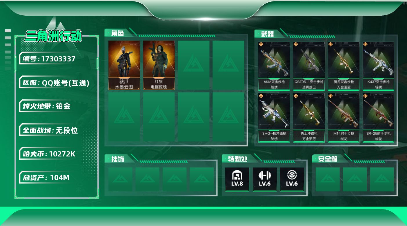 [17303337]【特价出售/店主推荐】104m总资产-10272k哈伏币-60烽火等级-铂金-1战场等级-无军衔 【干员外观】:骇爪-水墨云图,红狼-电锯惊魂 【近战皮肤】:近战-黑鹰 【传说外观】:M4A1突击步枪-阿米娅,AKM突击步枪-锦绣,QBZ95-1突击步枪-凌霄戍卫,ASh-12战斗步枪-鹅鸭杀,SCAR-H战斗步枪-水墨云图,SCAR-H战斗步枪-启航,G3战斗步枪-骑士,CAR-15突击步枪-阿米娅,腾龙突击步枪-万金泪冠,K437突击步枪-锦绣,KC17突击步枪-电锯惊魂,SMG-45冲锋枪-锦绣,勇士冲锋枪-万金泪冠,QCQ171冲锋枪-鹅鸭杀,QJB201轻机枪-鹅鸭杀,M14射手步枪-缄花,SR-25射手步枪-缄花,R93狙击步枪-维什戴尔,AWM狙击步枪-万金泪冠,.357左轮-缄花 【史诗外观】:K416突击步枪-冬日风情,SG552突击步枪-深海恐惧,SG552突击步枪-哈夫克警备,腾龙突击步枪-猎鳄行动,腾龙突击步枪-聚光灯,MP5冲锋枪-战术竞备,MP5冲锋枪-竞技风,勇士冲锋枪-深海恐惧,MP7冲锋枪-六套之力,PKM通用机枪-阿萨拉特攻,QJB201轻机枪-炽焰,M14射手步枪-工业狂潮,SV-98狙击步枪-囚徒,SV-98狙击步枪-猎鳄行动,M700狙击步枪-竞技风,M700狙击步枪-哈夫克警备 【稀有外观】:AKM突击步枪-肃杀,QBZ95-1突击步枪-公平竞技,K416突击步枪-一帆风顺,M7战斗步枪-捣蛋鬼,SG552突击步枪-贴花艺术, AK-12突击步枪-马年新春,SCAR-H战斗步枪-荣耀列队,腾龙突击步枪-冰天雪地,K437突击步枪-生存指令,MK47突击步枪-精英联盟,MP5冲锋枪-弄臣,MP5冲锋枪-哈夫克卫队,P90冲锋枪-黄昏,Vector冲锋枪-先锋,UZI冲锋枪-亚特兰蒂斯,SMG-45冲锋枪-行动开启,SMG-45冲锋枪-幻影结构,SMG-45冲锋枪-精英联盟,勇士冲锋枪-冰天雪地,M1014霰弹枪-幻影结构,M249轻机枪-冰天雪地,Mini-14射手步枪-荣耀列队,SKS射手步枪-弄臣,SV-98狙击步枪-星链科技,SV-98狙击步枪-哈夫克航天,SV-98狙击步枪-精英联盟,G18-星链科技,G18-哈夫克航天 【普通外观】:M4A1突击步枪-粉色涂装,M4A1突击步枪-高雅黑,QBZ95-1突击步枪-高