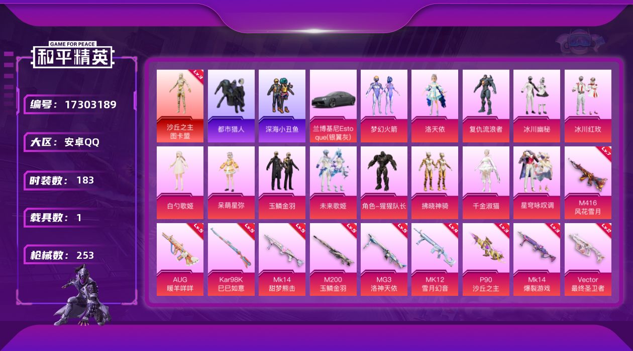 [17303189]【特价出售/店主推荐】安卓 手Q-1神装-13粉装-12特效枪-1载具-5粉色飞行器-83382热力值-11王牌印记-183套装-253枪皮