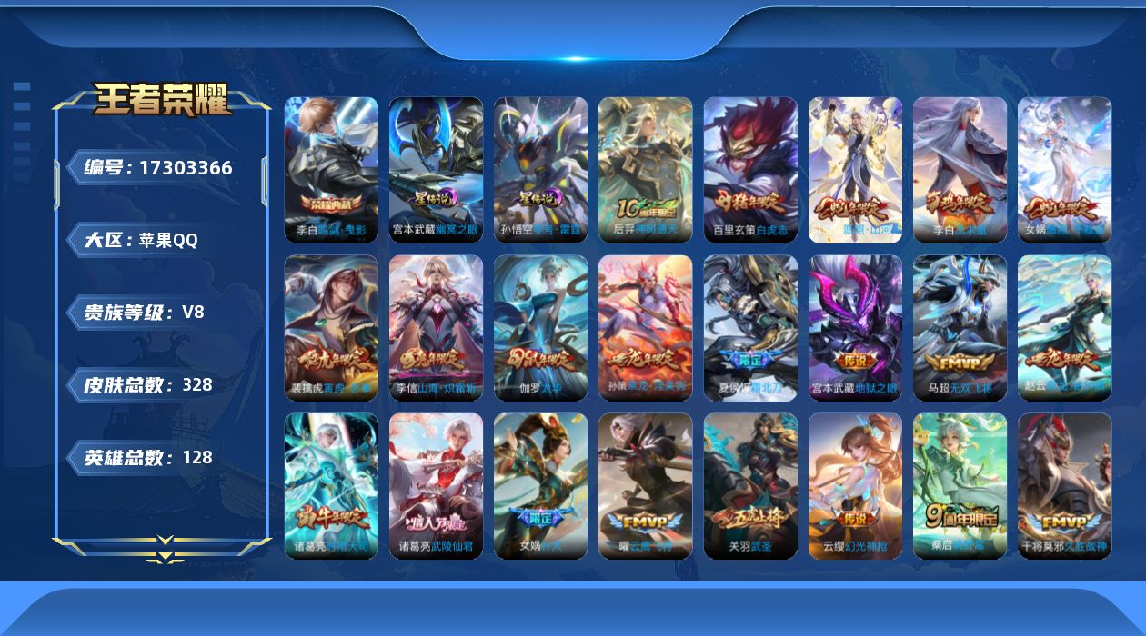 [17303366]可二次【特价出售/店主推荐】苹果Q-V8-最强王者段位-128英雄-328皮肤-1典藏皮肤-2星传说-30传说-106史诗