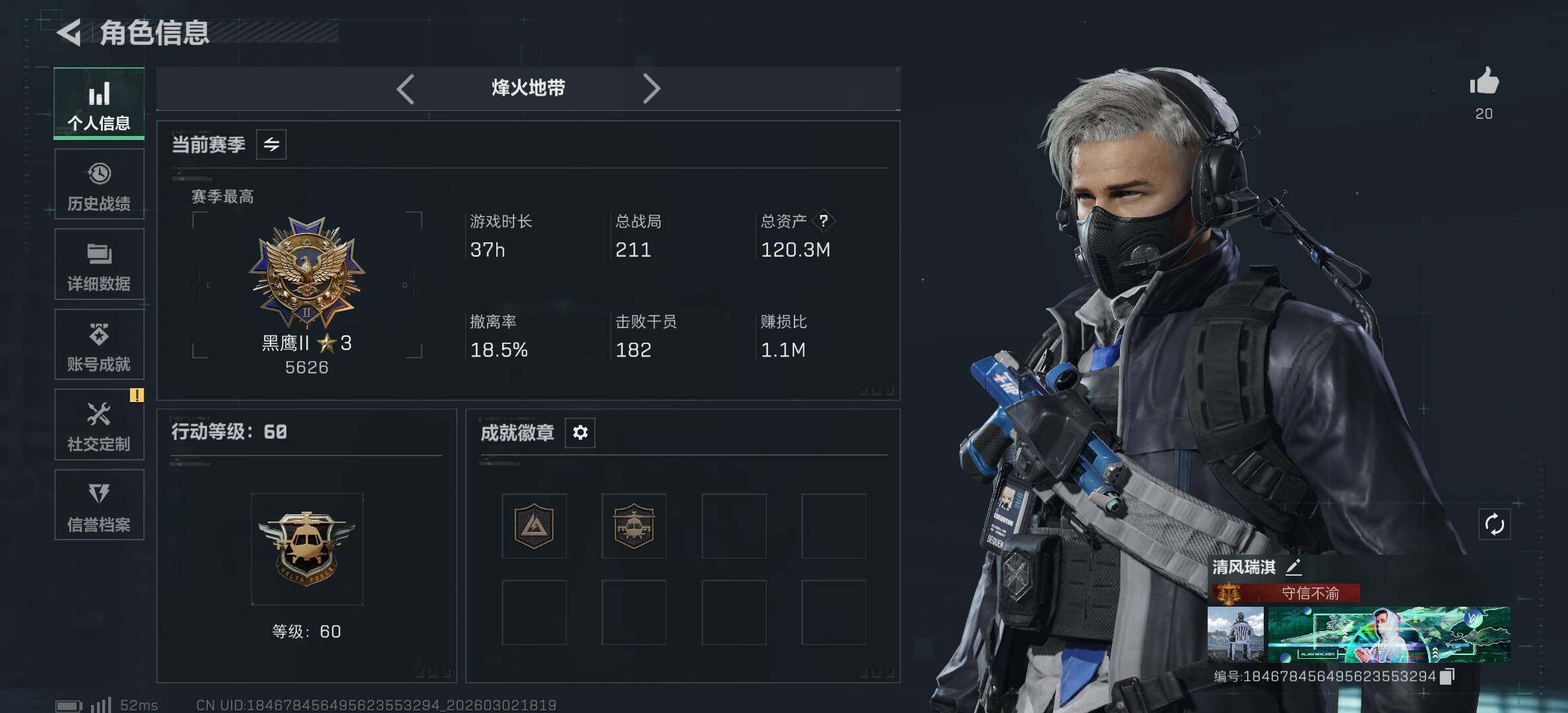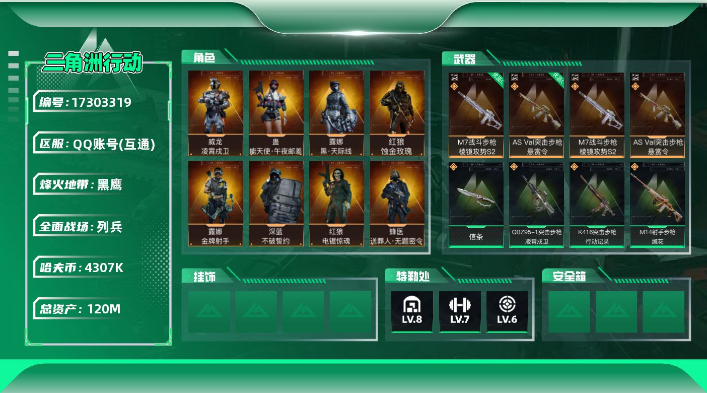 [17303319]120m总资产-4307k哈伏币-60烽火等级-黑鹰-8战场等级-列兵