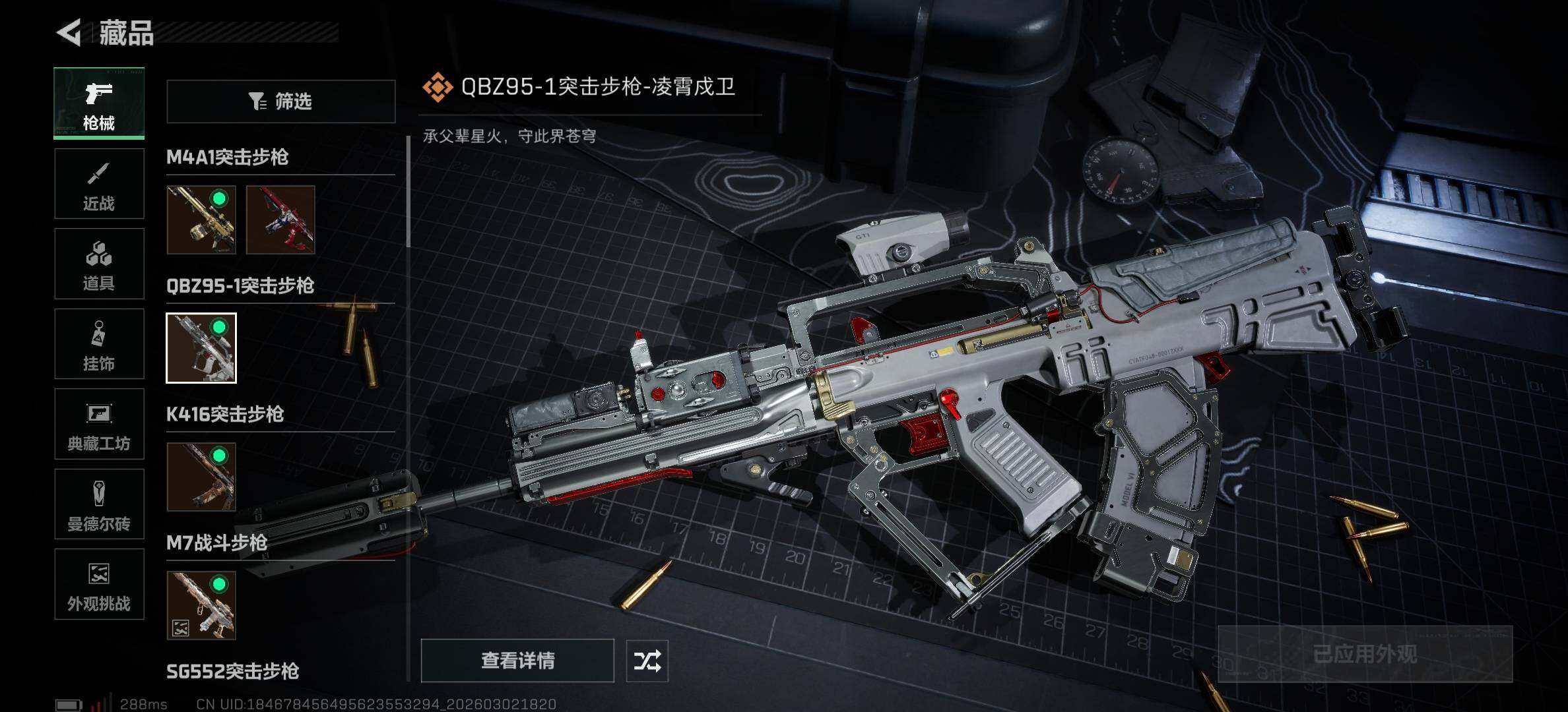【传说外观】:M4A1突击步枪-蚀金玫瑰,M4A1突击步枪-阿米娅,QBZ95-1突击步枪-凌霄戍卫,K416突击步枪-行动记录,SG552突击步枪-运动员,AK-12突击步枪-特斯拉线圈,SCAR-H【特价出售/店主推荐】战斗步枪-启航,CAR-15突击步枪-阿米娅,腾龙突击步枪-捞点薯条,KC17突击步枪-电锯惊魂,P90冲锋枪-信条,Vector冲锋枪-能天使-午夜邮差,UZI冲锋枪-特斯拉线圈,SR-3M紧凑突击步枪-特斯拉线圈,勇士冲锋枪-能天使-午夜邮差,725双管霰弹枪-送葬人-无题密令,M250通用机枪-骑士之心,M14射手步枪-蛮荒,M14射手步枪-缄花,SR-25射手步枪-信条,SR-25射手步枪-缄花,AWM狙击步枪-捞点薯条,.357左轮-缄花,93R-捞点薯条,复合弓-黑·天际线