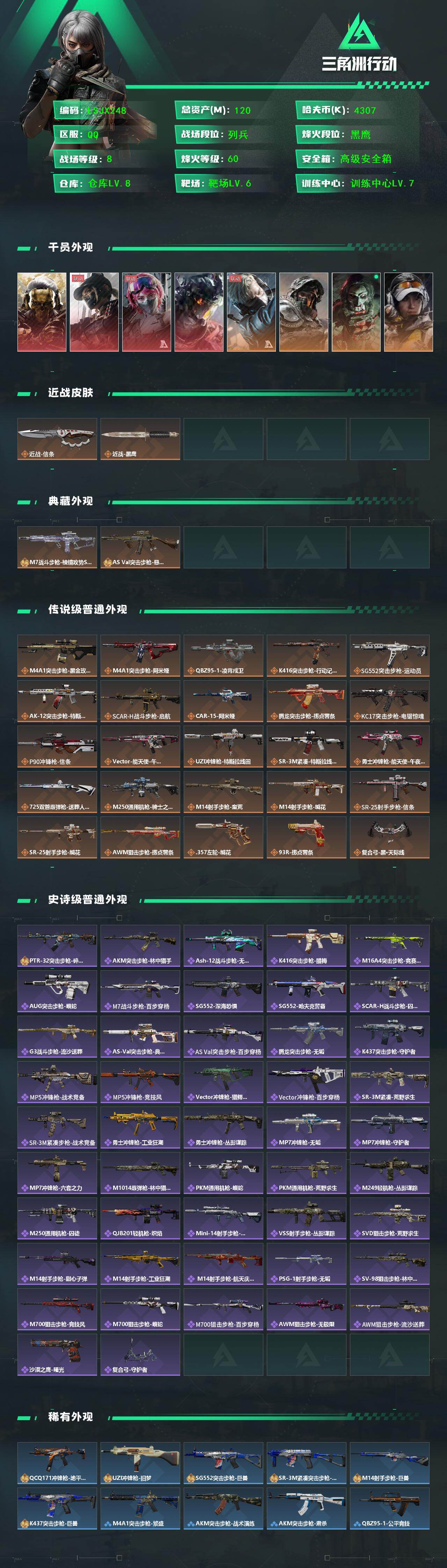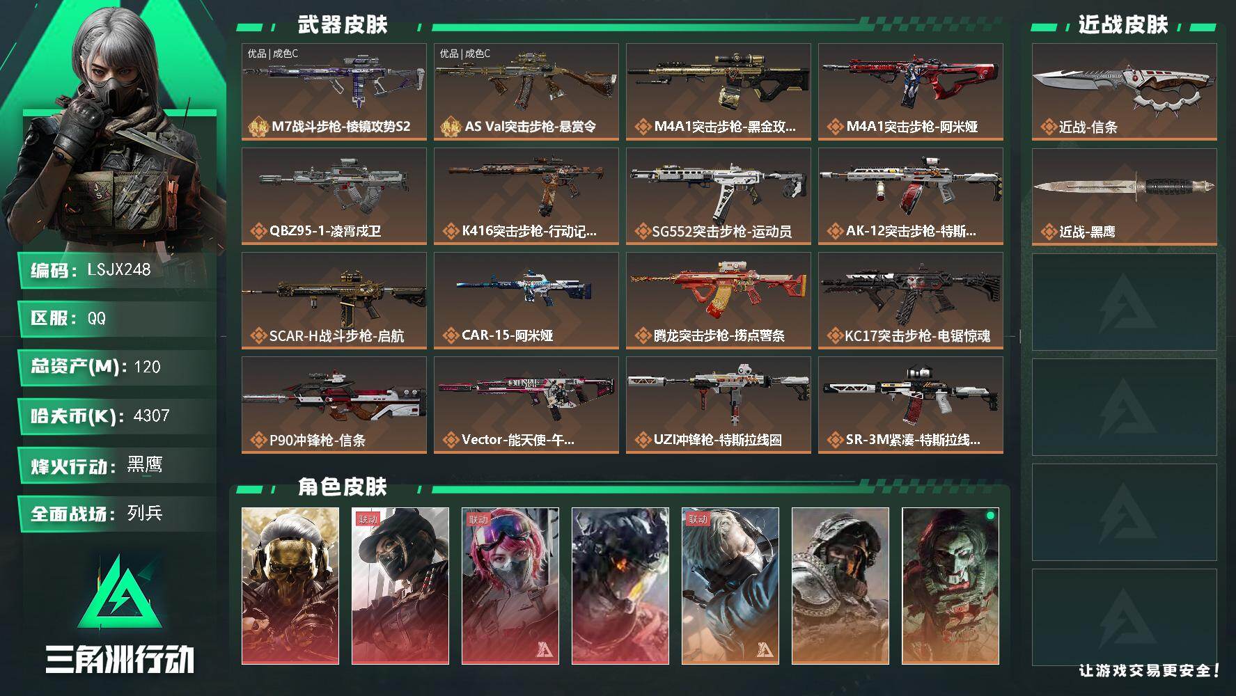 [17303319]120m总资产-4307k哈伏币-60烽火等级-黑鹰-8战场等级-列兵 【干员外观】:红狼-蚀金玫瑰,露娜-黑·天际线,蛊-能天使午夜邮差,威龙-凌霄戍卫,蜂医-送葬人·无题密令,深蓝-不破誓约,红狼-电锯惊魂,露娜-金牌射手 【近战皮肤】:近战-信条,近战-黑鹰 【典藏外观】:M7战斗步枪-棱镜攻势S2,AS Val突击步枪-悬赏令 【典藏外观成色】:M7战斗步枪-棱镜攻势S2(优品C),AS Val突击步枪-悬赏令(优品C) 【传说外观】:M4A1突击步枪-蚀金玫瑰,M4A1突击步枪-阿米娅,QBZ95-1突击步枪-凌霄戍卫,K416突击步枪-行动记录,SG552突击步枪-运动员,AK-12突击步枪-特斯拉线圈,SCAR-H【特价出售/店主推荐】战斗步枪-启航,CAR-15突击步枪-阿米娅,腾龙突击步枪-捞点薯条,KC17突击步枪-电锯惊魂,P90冲锋枪-信条,Vector冲锋枪-能天使-午夜邮差,UZI冲锋枪-特斯拉线圈,SR-3M紧凑突击步枪-特斯拉线圈,勇士冲锋枪-能天使-午夜邮差,725双管霰弹枪-送葬人-无题密令,M250通用机枪-骑士之心,M14射手步枪-蛮荒,M14射手步枪-缄花,SR-25射手步枪-信条,SR-25射手步枪-缄花,AWM狙击步枪-捞点薯条,.357左轮-缄花,93R-捞点薯条,复合弓-黑·天际线 【史诗外观】:PTR-32突击步枪-碎冰行动,AKM突击步枪-林中猎手,ASh-12战斗步枪-无极限,K416突击步枪-腊梅,M16A4突击步枪-竞赛选手,AUG突击步枪-蝮蛇,M7战斗步枪-百步穿杨,SG552突击步枪-深海恐惧,SG552突击步枪-哈夫克警备,SCAR-H战斗步枪-囚徒,G3战斗步枪-流沙送葬,AS Val突击步枪-典狱官,AS Val突击步枪-百步穿杨,腾龙突击步枪-无垢,K437突击步枪-守护者,MP5冲锋枪-战术竞备,MP5冲锋枪-竞技风,Vector冲锋枪-猎鳄行动,Vector冲锋枪-百步穿杨,SR-3M紧凑突击步枪-荒野求生,SR-3M紧凑突击步枪-战术竞备,勇士冲锋枪-工业狂潮,勇士冲锋枪-丛影谍踪,MP7冲锋枪-无垢,MP7冲锋枪-守护者,MP7冲锋枪-六套之力,M1014霰弹枪-林中猎手,PKM通用机枪-蝮蛇,PKM通用机枪-荒野求生,M249轻机枪-丛影谍踪,M250通用机枪-囚徒,QJB201轻