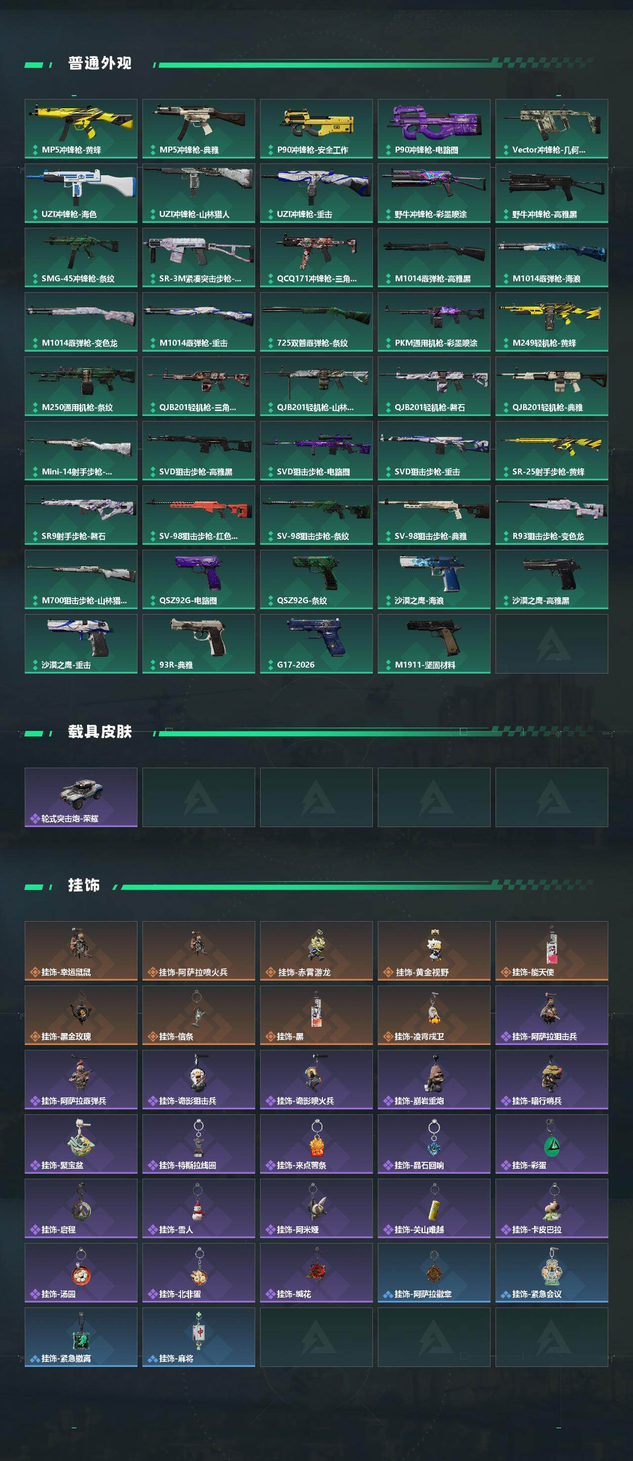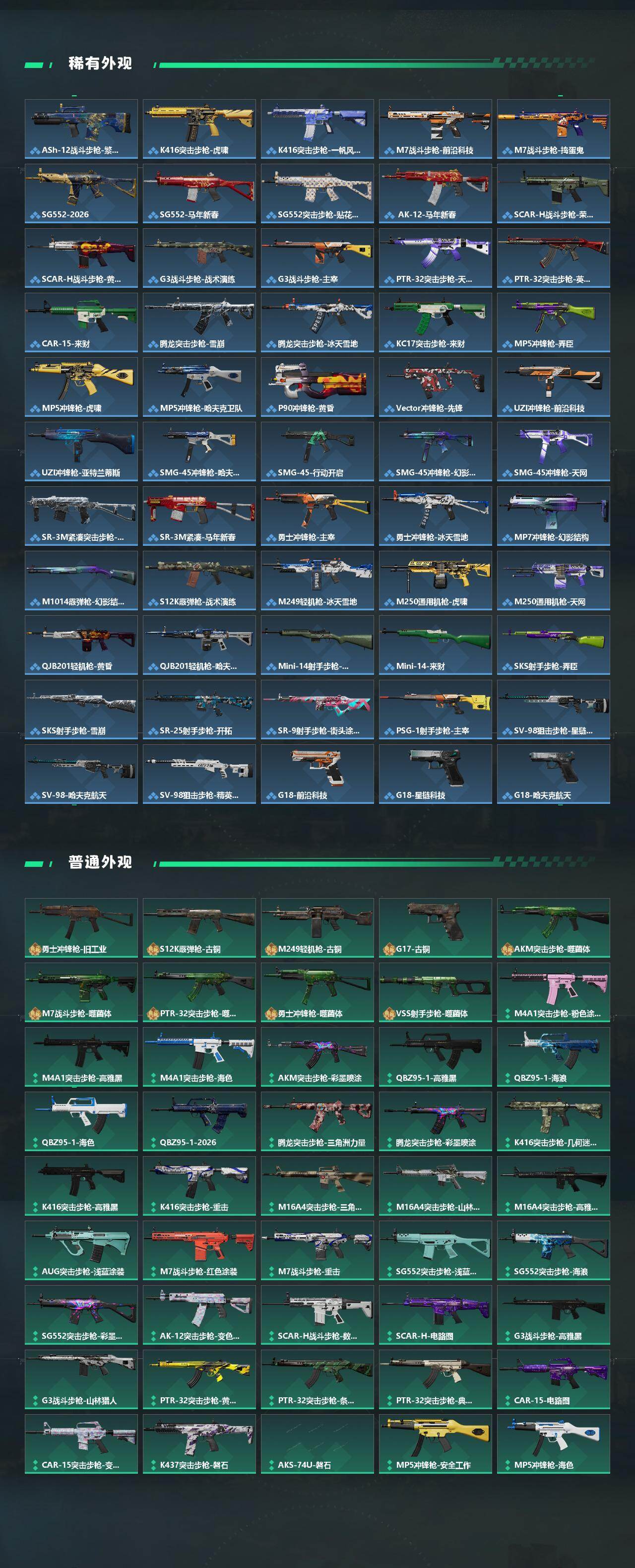 【史诗外观】:PTR-32突击步枪-碎冰行动,AKM突击步枪-林中猎手,ASh-12战斗步枪-无极限,K416突击步枪-腊梅,M16A4突击步枪-竞赛选手,AUG突击步枪-蝮蛇,M7战斗步枪-百步穿杨,SG552突击步枪-深海恐惧,SG552突击步枪-哈夫克警备,SCAR-H战斗步枪-囚徒,G3战斗步枪-流沙送葬,AS Val突击步枪-典狱官,AS Val突击步枪-百步穿杨,腾龙突击步枪-无垢,K437突击步枪-守护者,MP5冲锋枪-战术竞备,MP5冲锋枪-竞技风,Vector冲锋枪-猎鳄行动,Vector冲锋枪-百步穿杨,SR-3M紧凑突击步枪-荒野求生,SR-3M紧凑突击步枪-战术竞备,勇士冲锋枪-工业狂潮,勇士冲锋枪-丛影谍踪,MP7冲锋枪-无垢,MP7冲锋枪-守护者,MP7冲锋枪-六套之力,M1014霰弹枪-林中猎手,PKM通用机枪-蝮蛇,PKM通用机枪-荒野求生,M249轻机枪-丛影谍踪,M250通用机枪-囚徒,QJB201轻