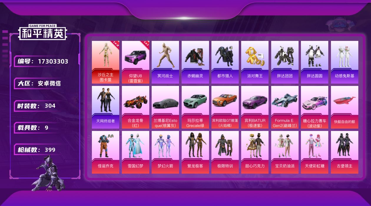 [17303303]【特价出售/店主推荐】安卓 微信-1神装-20粉装-12特效枪-9载具-9粉色飞行器-145177热力值-30王牌印记-304套装-399枪皮 【红色载具】:仰望U8(雷霆紫)(一级) 【红色神装等级】:沙丘之主-图卡盟(三级) 【红色角色神装】:沙丘之主-图卡盟 【热门品类】:粉装-怪诞乔克,粉装-雪国幻梦,粉装-梦幻火箭,粉装-繁龙极客,套装-浪漫天命,套装-赤蝎幽灵,套装-都市猎人,套装-冥河战士,套装-派对舞王,套装-胖达团团,套装-胖达圆圆,套装-黄金大亨,套装-天网终结者,套装-金羽特工,套装-动感兔斯基人偶服,套装-SS1特训,套装-龟仙人,套装-暗影哥特,套装-摄影小熊猫,套装-红红火火,角色-8号机,角色-Mark.06,熔岩游骑兵连帽夹克 【粉色套装】:粉装-极限特训,粉装-怪诞乔克,粉装-甜心巧克力,粉装-宝贝奶油派,粉装-天使彩虹糖,粉装-雪国幻梦,粉装-梦幻火箭,粉装-古堡领主,粉装-冰霜白皇,角色-2号机款机体服,粉装-蓝莓炮弹,角色-小可学妹,角色-圣堂之誓,粉装-繁龙极客,角色-烟云彩露,角色-小蓝,角色-美雪,角色-光极星,角色-初号机 觉醒Ver.,角色-罪夜之冕 【粉色枪皮等级】:SCAR-L-童趣迷兔(七级),SCAR-L-锦绣绵绵(五级),M416-心之恋语(六级),GROZA-巴啦啦小魔仙(七级),M762-冷魅冰骑(三级),P90-电糖天使(三级),Kar98K-巳巳如意(五级),M24-镜域双华(三级),Mk14-福马献瑞(五级),DP-28-豹影疾电(五级),MG3-洛神天依(三级),MG3-酷泡奶龙(四级) 【粉色载具】:仰望U8(雷霆紫),兰博基尼Estoque(银翼灰),玛莎拉蒂Grecale(薄荷绿),宾利欧陆GT敞篷(火焰橘),宾利BATUR(极速紫),合金龙骨(红),Formula E Gen2(巅峰兰),糖心拉力赛车(波动紫),僚机-萌兔起飞,快艇-自由的鲸 【粉色枪皮】:SCAR-L-童趣迷兔,SCAR-L-锦绣绵绵,M416-心之恋语,GROZA-巴啦啦小魔仙,M762-冷魅冰骑,P90-电糖天使,Kar98K-巳巳如意,M24-镜域双华,Mk14-福马献瑞,DP-28-豹影疾电,MG3-洛神天依,MG3-酷泡奶龙 【粉色飞行器】:炫彩糖果飞行器,梦幻火箭飞行器,古堡领主飞行器,天之羽翼飞行器,白