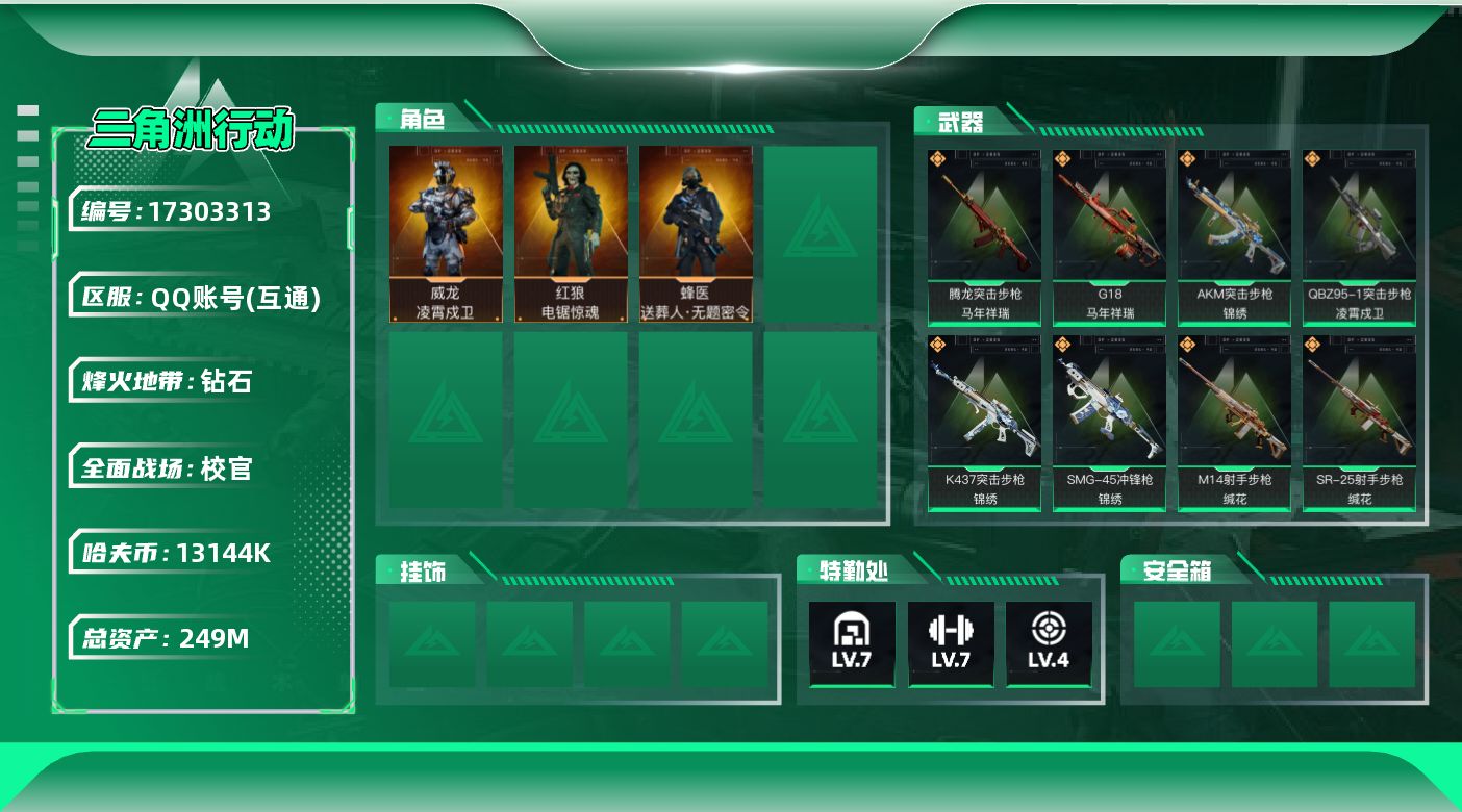 [17303313]【特价出售/店主推荐】249m总资产-13144k哈伏币-60烽火等级-钻石-50战场等级-校官 【干员外观】:威龙-凌霄戍卫,蜂医-送葬人·无题密令,红狼-电锯惊魂 【近战皮肤】:近战-处刑者2级,近战-黑鹰 【传说外观】:M4A1突击步枪-阿米娅,AKM突击步枪-锦绣,QBZ95-1突击步枪-凌霄戍卫,ASh-12战斗步枪-鹅鸭杀,M16A4突击步枪-狩猎时刻,AK-12突击步枪-特斯拉线圈,SCAR-H战斗步枪-启航,G3战斗步枪-狩猎时刻,G3战斗步枪-骑士,CAR-15突击步枪-阿米娅,腾龙突击步枪-马年祥瑞,K437突击步枪-锦绣,KC17突击步枪-电锯惊魂,Vector冲锋枪-狩猎时刻,UZI冲锋枪-特斯拉线圈,SMG-45冲锋枪-锦绣,SR-3M紧凑突击步枪-特斯拉线圈,勇士冲锋枪-能天使-午夜邮差,QCQ171冲锋枪-鹅鸭杀,725双管霰弹枪-送葬人-无题密令,QJB201轻机枪-鹅鸭杀,M14射手步枪-缄花,SKS射手步枪-骑士,SR-25射手步枪-缄花,AWM狙击步枪-万金泪冠,.357左轮-缄花,G18-马年祥瑞,复合弓-黑·天际线 【史诗外观】:PTR-32突击步枪-碎冰行动,AKM突击步枪-林中猎手,QBZ95-1突击步枪-曙光,K416突击步枪-冬日风情,K416突击步枪-阿萨拉特攻,K416突击步枪-缄默情歌,AUG突击步枪-蝮蛇,SG552突击步枪-深海恐惧,SG552突击步枪-哈夫克警备,SCAR-H战斗步枪-囚徒,G3战斗步枪-哈夫克警备,AS Val突击步枪-典狱官,腾龙突击步枪-无垢,腾龙突击步枪-猎鳄行动,KC17突击步枪-缄默情歌,MP5冲锋枪-深海恐惧,MP5冲锋枪-战术竞备,MP5冲锋枪-竞技风,Vector冲锋枪-阿萨拉文明,SMG-45冲锋枪-阿萨拉特攻,SR-3M紧凑突击步枪-荒野求生,SR-3M紧凑突击步枪-战术竞备,勇士冲锋枪-深海恐惧,勇士冲锋枪-工业狂潮,MP7冲锋枪-无垢,MP7冲锋枪-六套之力,M1014霰弹枪-林中猎手,S12K霰弹枪-曙光,S12K霰弹枪-缄默情歌,PKM通用机枪-蝮蛇,PKM通用机枪-荒野求生,PKM通用机枪-阿萨拉特攻,M250通用机枪-囚徒,QJB201轻机枪-炽焰,SVD狙击步枪-阿萨拉工艺,SVD狙击步枪-荒野求生,M14射手步枪-工业狂潮,PSG-1射手步枪-无垢,