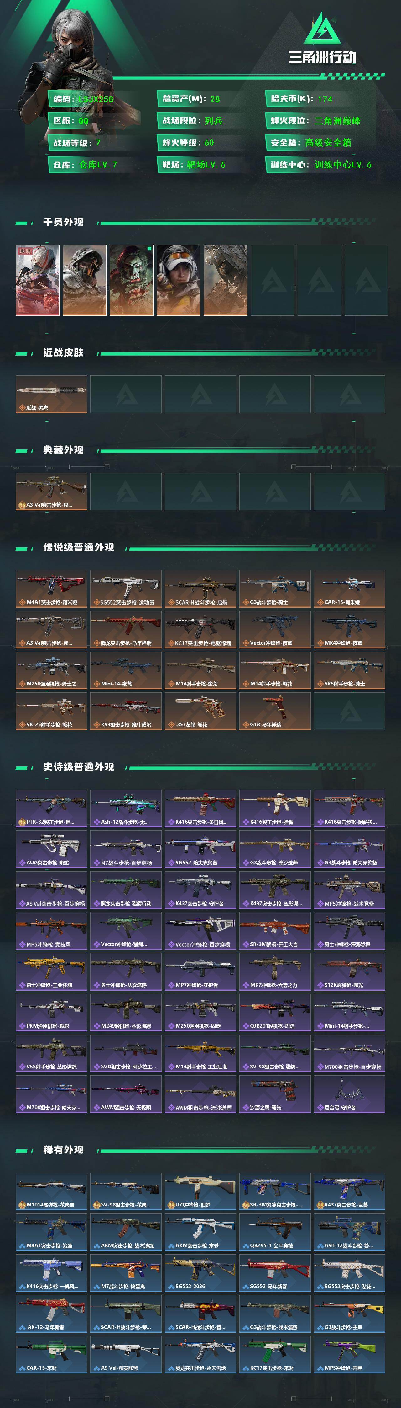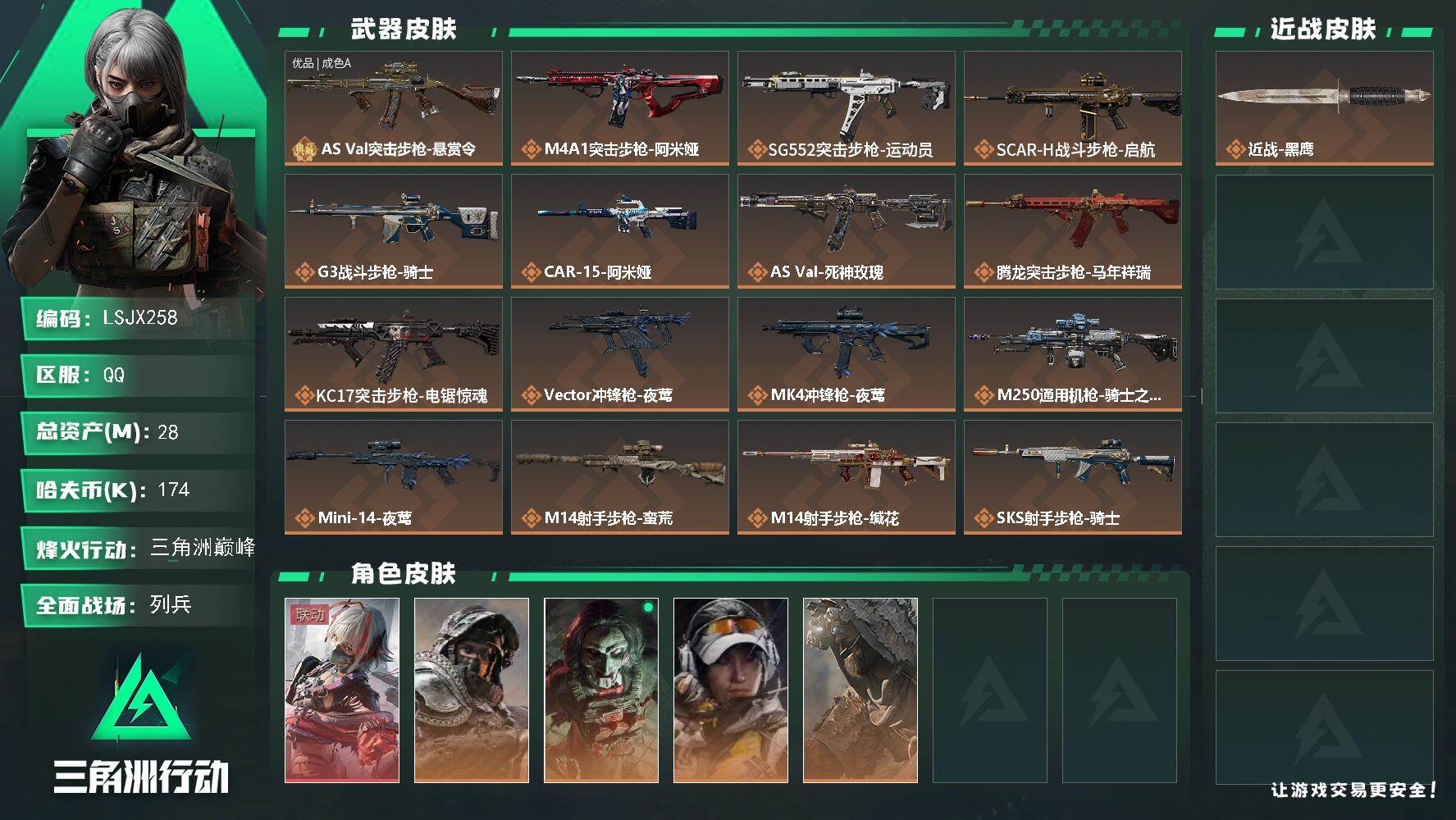 [17303344]【特价出售/店主推荐】28m总资产-174k哈伏币-60烽火等级-三角洲巅峰-7战场等级-列兵 【干员外观】:骇爪-维什戴尔,深蓝-不破誓约,红狼-电锯惊魂,露娜-金牌射手,乌鲁鲁-荒原猎手 【近战皮肤】:近战-黑鹰 【典藏外观】:AS Val突击步枪-悬赏令 【典藏外观成色】:AS Val突击步枪-悬赏令(优品A) 【传说外观】:M4A1突击步枪-阿米娅,SG552突击步枪-运动员,SCAR-H战斗步枪-启航,G3战斗步枪-骑士,CAR-15突击步枪-阿米娅,AS Val突击步枪-死神玫瑰,腾龙突击步枪-马年祥瑞,KC17突击步枪-电锯惊魂,Vector冲锋枪-夜莺,MK4冲锋枪-夜莺,M250通用机枪-骑士之心,Mini-14射手步枪-夜莺,M14射手步枪-蛮荒,M14射手步枪-缄花,SKS射手步枪-骑士,SR-25射手步枪-缄花,R93狙击步枪-维什戴尔,.357左轮-缄花,G18-马年祥瑞 【史诗外观】:PTR-32突击步枪-碎冰行动,ASh-12战斗步枪-无极限,K416突击步枪-冬日风情,K416突击步枪-腊梅,K416突击步枪-阿萨拉特攻,AUG突击步枪-蝮蛇,M7战斗步枪-百步穿杨,SG552突击步枪-哈夫克警备,G3战斗步枪-流沙送葬,G3战斗步枪-哈夫克警备,AS Val突击步枪-百步穿杨,腾龙突击步枪-猎鳄行动,K437突击步枪-守护者,K437突击步枪-丛影谍踪,MP5冲锋枪-战术竞备,MP5冲锋枪-竞技风,Vector冲锋枪-猎鳄行动,Vector冲锋枪-百步穿杨,SR-3M紧凑突击步枪-开工大吉,勇士冲锋枪-深海恐惧,勇士冲锋枪-工业狂潮,勇士冲锋枪-丛影谍踪,MP7冲锋枪-守护者,MP7冲锋枪-六套之力,S12K霰弹枪-曙光,PKM通用机枪-蝮蛇,M249轻机枪-丛影谍踪,M250通用机枪-囚徒,QJB201轻机枪-炽焰,Mini-14射手步枪-守护者,VSS射手步枪-丛影谍踪,SVD狙击步枪-阿萨拉工艺,M14射手步枪-工业狂潮,SV-98狙击步枪-猎鳄行动,M700狙击步枪-百步穿杨,M700狙击步枪-哈夫克警备,AWM狙击步枪-无极限,AWM狙击步枪-流沙送葬,沙漠之鹰-曙光,复合弓-守护者 【稀有外观】:M1014霰弹枪-花岗岩,SV-98狙击步枪-花岗岩,UZI冲锋枪-旧梦,SR-3M紧凑突击步枪-巨兽,K437突击步枪-巨