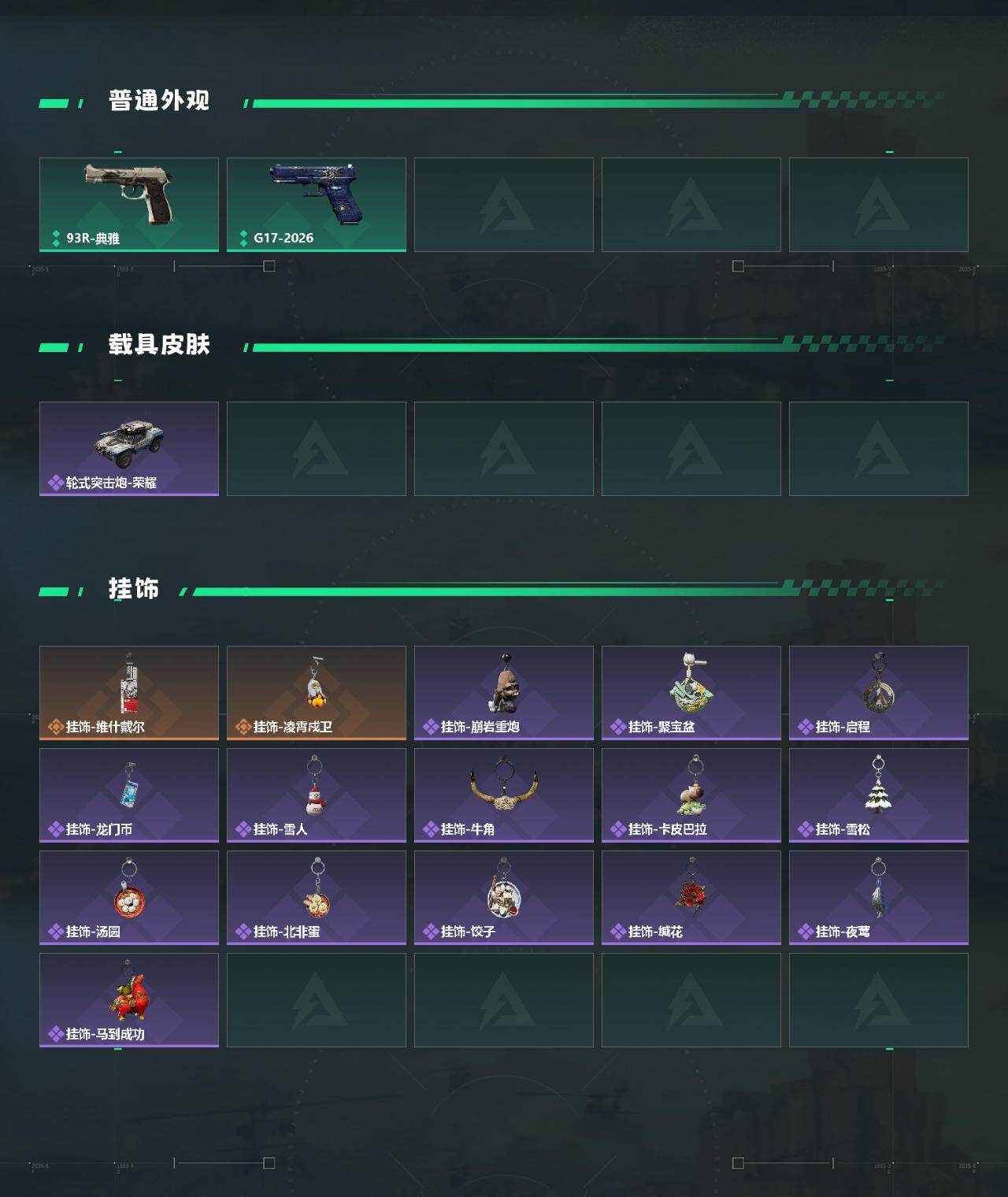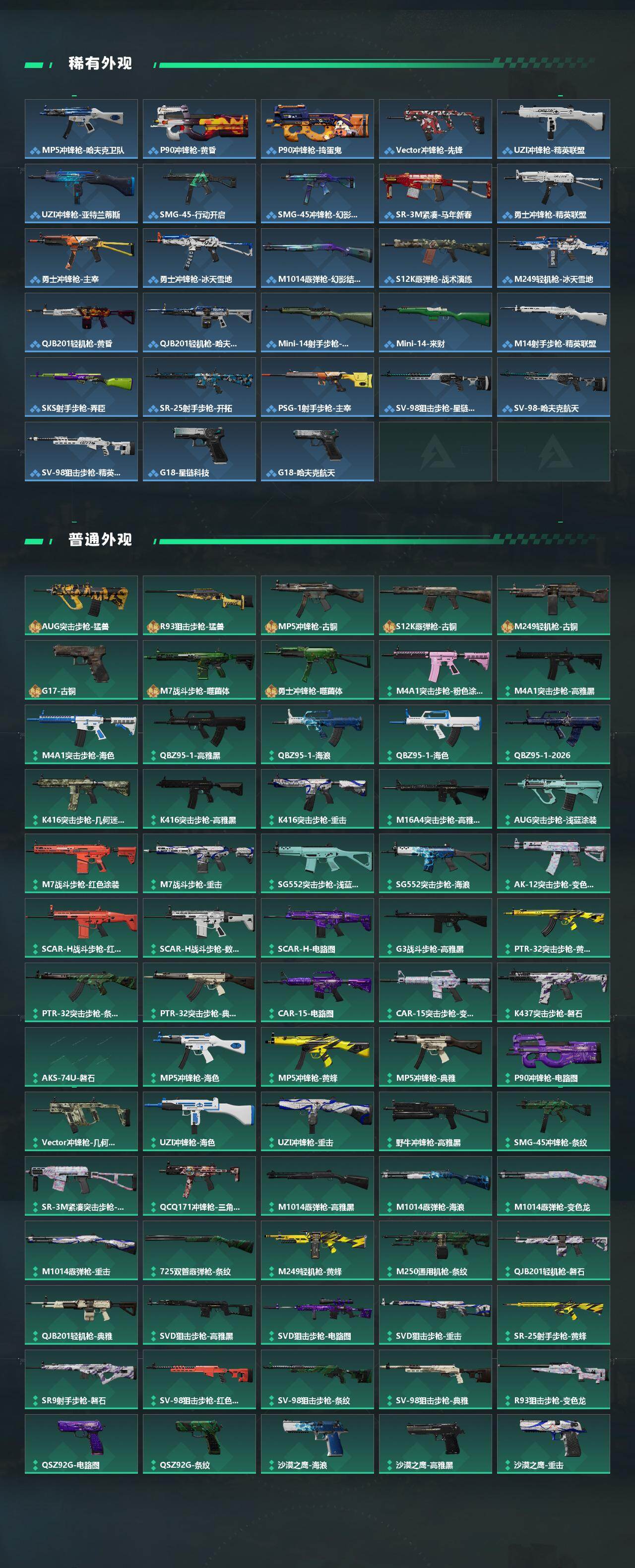 【史诗外观】:PTR-32突击步枪-碎冰行动,ASh-12战斗步枪-无极限,K416突击步枪-冬日风情,K416突击步枪-腊梅,K416突击步枪-阿萨拉特攻,AUG突击步枪-蝮蛇,M7战斗步枪-百步穿杨,SG552突击步枪-哈夫克警备,G3战斗步枪-流沙送葬,G3战斗步枪-哈夫克警备,AS Val突击步枪-百步穿杨,腾龙突击步枪-猎鳄行动,K437突击步枪-守护者,K437突击步枪-丛影谍踪,MP5冲锋枪-战术竞备,MP5冲锋枪-竞技风,Vector冲锋枪-猎鳄行动,Vector冲锋枪-百步穿杨,SR-3M紧凑突击步枪-开工大吉,勇士冲锋枪-深海恐惧,勇士冲锋枪-工业狂潮,勇士冲锋枪-丛影谍踪,MP7冲锋枪-守护者,MP7冲锋枪-六套之力,S12K霰弹枪-曙光,PKM通用机枪-蝮蛇,M249轻机枪-丛影谍踪,M250通用机枪-囚徒,QJB201轻机枪-炽焰,Mini-14射手步枪-守护者,VSS射手步枪-丛影谍踪,SVD狙击步枪-阿萨拉工艺,M14射手步枪-工业狂潮,SV-98狙击步枪-猎鳄行动,M700狙击步枪-百步穿杨,M700狙击步枪-哈夫克警备,AWM狙击步枪-无极限,AWM狙击步枪-流沙送葬,沙漠之鹰-曙光,复合弓-守护者