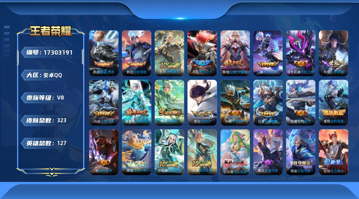 [17303191]可二次【店主推荐捡漏号!可直接换绑】安卓Q-V8-永恒钻石II段位-127英雄-323皮肤-2典藏皮肤-15传说-77史诗 【英雄全皮】:刘禅全皮,戈娅全皮,空空儿全皮,影全皮 【荣耀典藏】:李白鸣剑曳影,韩信弑枪猎影 【传说皮肤】:后羿神树通天,桑启鸣野蒿,马超琥珀纪元,澜逐花归海,李信山海炽霜斩,吕布怒海麟威,李白诗剑行,百里守约碎云,马超无双飞将,孙策末日机甲,诸葛亮时雨天司,铠绛天战甲,虞姬启明星使,李信一念神魔,宫本武藏地狱之眼 【限定皮肤】:蒙犽顽岩魄,蔡文姬夏日便利店,大乔绒语心约,虞姬夏日便利店,姜子牙天穹之誓,杨戬破阵退雄兵,狄仁杰阴阳师,赵云皇家上将,孙尚香蔷薇恋人,庄周高山流水,芈月重明,曹操烛龙,典韦穷奇,狄仁杰魔术师,项羽海滩派对,老夫子醍醐杖,程咬金演武夺筹,韩信飞衡,李元芳匿光侦查者,李元芳云中旅人,虞姬启明星使,钟馗驱傩正仪,杨玉环遇见飞天,女娲朔望之晖,诸葛亮时雨天司,裴擒虎李小龙,裴擒虎擒涛扼浪,狂铁御狮,李信山海炽霜斩,嫦娥拒霜思,西施玲珑珍味,西施至美乘鲤谣,鲁班大师探海日志,桑启海盐诗旅,戈娅驭风魔法,艾琳流音漫舞,司空震地狱燃心,阿古朵江河有灵,张良古海寻踪,蒙犽百解令,高渐离燃音魔法,妲己灵卜魔法,鬼谷子天穹祈灯,马超琥珀纪元,沈梦溪龙舞盛年,鲁班七号蔬乡物语,李元芳蔬乡物语,刘邦剑破天穹,周瑜熔金海岸 【年限皮肤】:韩信飞衡,诸葛亮时雨天司,李信山海炽霜斩 【赛季限定】:曹操烛龙,芈月重明,典韦穷奇,狂铁御狮,老夫子醍醐杖,程咬金演武夺筹,钟馗驱傩正仪,李元芳云中旅人,桑启海盐诗旅,裴擒虎擒涛扼浪,鲁班大师探海日志,张良古海寻踪,鬼谷子天穹祈灯,刘邦剑破天穹,姜子牙天穹之誓,东皇太一噬灭天穹,太乙真人谧流熔炉,钟馗虚灵犬护,甄姬逆浪荇歌,亚瑟荣光之誓 【战令限定】:女娲朔望之晖,戈娅驭风魔法,西施玲珑珍味,司空震地狱燃心,艾琳流音漫舞,高渐离燃音魔法,妲己灵卜魔法,鲁班七号蔬乡物语,李元芳蔬乡物语,蔡文姬夏日便利店,虞姬夏日便利店,孙膑茶境仙,马超访茗客,刘禅鸭鸭历险记,沈梦溪鸭鸭历险记,周瑜百相守梦,孙策百相守梦,周瑜线条小狗 【史诗皮肤】:项羽苍穹之光,露娜紫霞仙子,赵云皇家上将,赵云未来纪元,貂蝉圣诞恋歌,甄姬冰雪圆舞曲,狄仁杰魔术师,廉颇地狱岩魂,宫本武藏鬼剑武藏,孙尚香蔷薇恋人,孙尚香水果甜心,嬴政暗夜贵公