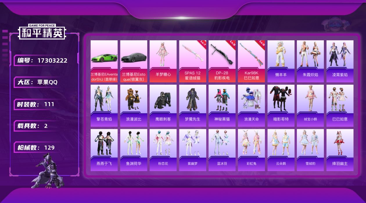 [17303222]【特价出售/店主推荐】苹果 手Q-1粉装-4特效枪-2载具-0粉色飞行器-39764热力值-8王牌印记-111套装-129枪皮 【热门品类】:套装-浪漫天命,套装-暗影哥特,套装-浪漫波比 【粉色套装】:角色-羊梦糖心 【粉色枪皮等级】:Kar98K-巳巳如意(五级),Mk14-福马献瑞(四级),SPAS-12-蜜语绒猫(七级),DP-28-豹影疾电(五级) 【粉色载具】:兰博基尼Aventador SVJ(翡翠绿),兰博基尼Estoque(银翼灰) 【粉色枪皮】:Kar98K-巳巳如意,Mk14-福马献瑞,SPAS-12-蜜语绒猫,DP-28-豹影疾电 【粉色降落伞】:第五大道降落伞,虎痴许褚降落伞 【稀有套装】:套装-绒宝小鹅,套装-巳巳如意,套装-燕燕于飞,套装-鱼渊荷华,套装-粉恋花,套装-紫幽梦,套装-蓝冰羽,套装-彩虹兔,套装-云朵鹅,套装-雪绒豹,角色-绛羽幽主,套装-朱霞炽焰,套装-凌霄紫焰,套装-擎苍青焰,玩偶服-懒羊羊,角色-曹焱兵 【稀有枪皮】:AKM-彩虹符号,AKM-破晓战魂,AKM-霓虹街区,AKM-龙的传人,SCAR-L-玉兔迎春,SCAR-L-黄金龙骨,M416-糯团青竹,M416-蓝色火焰,GROZA-异彩先驱,GROZA-影袭,GROZA-田园牧歌,AUG-耀粉歌者,QBZ-彩虹符号,M762-彩虹符号,M762-瑞龙福将,M762-云朵鹅,AC-VAL-天降萌叽,蜜獾-娇憨猪猪,ARX-凌霄紫焰,UZI-啾咪啾咪,UZI-娇憨猪猪,UZI-影袭,UMP45-蓝色火焰,UMP45-绒宝小鹅,Vector-生命誓言,Vector-田园牧歌,汤姆逊-天降萌叽,汤姆逊-异彩先驱,汤姆逊-炫彩节奏,MP5K-异彩先驱,JS9-凌霄紫焰,P90-巳巳如意,Kar98K-红色方程式,Kar98K-星穹咏叹调,M24-影袭,VSS-田园牧歌,Mini14-异彩先驱,Mini14-海渊国主,Mini14-耀粉歌者,Win94-瑞龙福将,SLR-娇憨猪猪,莫辛纳甘-蜜语绒猫,SVD-云朵鹅,S686-蜜语绒猫,S686-奇异狩猎者,S686-生命誓言,S686-巳巳如意,S12K-瑞龙福将,S12K-破晓战魂,S12K-娇憨猪猪,DBS-幻彩电音,SPAS-12-田园牧歌,SPAS-12-云朵鹅,M249-妙红点点,M249-彩虹符号,M249-