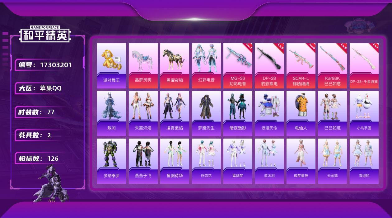 [17303201]【特价出售/店主推荐】苹果 手Q-1粉装-6特效枪-2载具-3粉色飞行器-36876热力值-7王牌印记-77套装-126枪皮 【热门品类】:套装-浪漫天命,套装-派对舞王,套装-龟仙人 【粉色套装】:粉装-幻彩电音 【粉色枪皮等级】:SCAR-L-锦绣绵绵(五级),UMP45-萌骑冒险(二级),Kar98K-巳巳如意(五级),DP-28-千金淑猫(一级),DP-28-豹影疾电(五级),MG-36-幻彩电音(七级) 【粉色载具】:晶梦灵驹,黑曜夜骑 【粉色枪皮】:SCAR-L-锦绣绵绵,UMP45-萌骑冒险,Kar98K-巳巳如意,DP-28-千金淑猫,DP-28-豹影疾电,MG-36-幻彩电音 【粉色飞行器】:炫彩糖果飞行器,圣域金龙飞行器 【粉色降落伞】:江南烟雨降落伞,千金淑猫降落伞,樱桃泡泡降落伞,智耀战神降落伞,幻彩电音降落伞,异瞳寒姬降落伞,炫彩糖果降落伞 【稀有套装】:套装-龟仙人,套装-巳巳如意,套装-小鸟芋圆,角色-多纳泰罗,套装-燕燕于飞,套装-鱼渊荷华,套装-粉恋花,套装-紫幽梦,套装-蓝冰羽,角色-瑰梦爱神,套装-云朵鹅,套装-雪绒豹,角色-时希公主,套装-朱霞炽焰,套装-凌霄紫焰,角色-敖闰,套装-雨过天青,套装-红釉青花 【稀有枪皮】:AKM-江南烟雨,AKM-龙的传人,AKM-玄冥寒域,M16A4-最终圣卫者,SCAR-L-夜灯,SCAR-L-炫彩节奏,SCAR-L-玉兔迎春,M416-糯团青竹,M416-蓝色火焰,GROZA-2B战斗服款,AUG-耀粉歌者,M762-云朵鹅,G36C-星穹咏叹调,AC-VAL-天降萌叽,ARX-凌霄紫焰,UZI-啾咪啾咪,UMP45-夜灯,UMP45-炫光之旅,Vector-焰鹰斗篷,Vector-生命誓言,汤姆逊-天降萌叽,汤姆逊-耀粉歌者,JS9-凌霄紫焰,P90-巳巳如意,M24-影袭,AWM-焰鹰斗篷,SKS-炫彩节奏,Mini14-穿刺龙虾,Mini14-耀粉歌者,AMR-墨龙九天,M417-惊鸿侠骨,M200-惊鸿侠骨,SVD-云朵鹅,S686-巳巳如意,S686-千金淑猫,S12K-玩趣呆呆,S12K-幻世战舞者,S12K-智耀战神,DBS-焰鹰斗篷,SPAS-12-云朵鹅,M249-彩虹符号,DP-28-焰鹰斗篷,MG3-惊鸿侠骨,MG-36-凌霄紫焰,P92-凌霄紫焰,蝎式手枪-六号