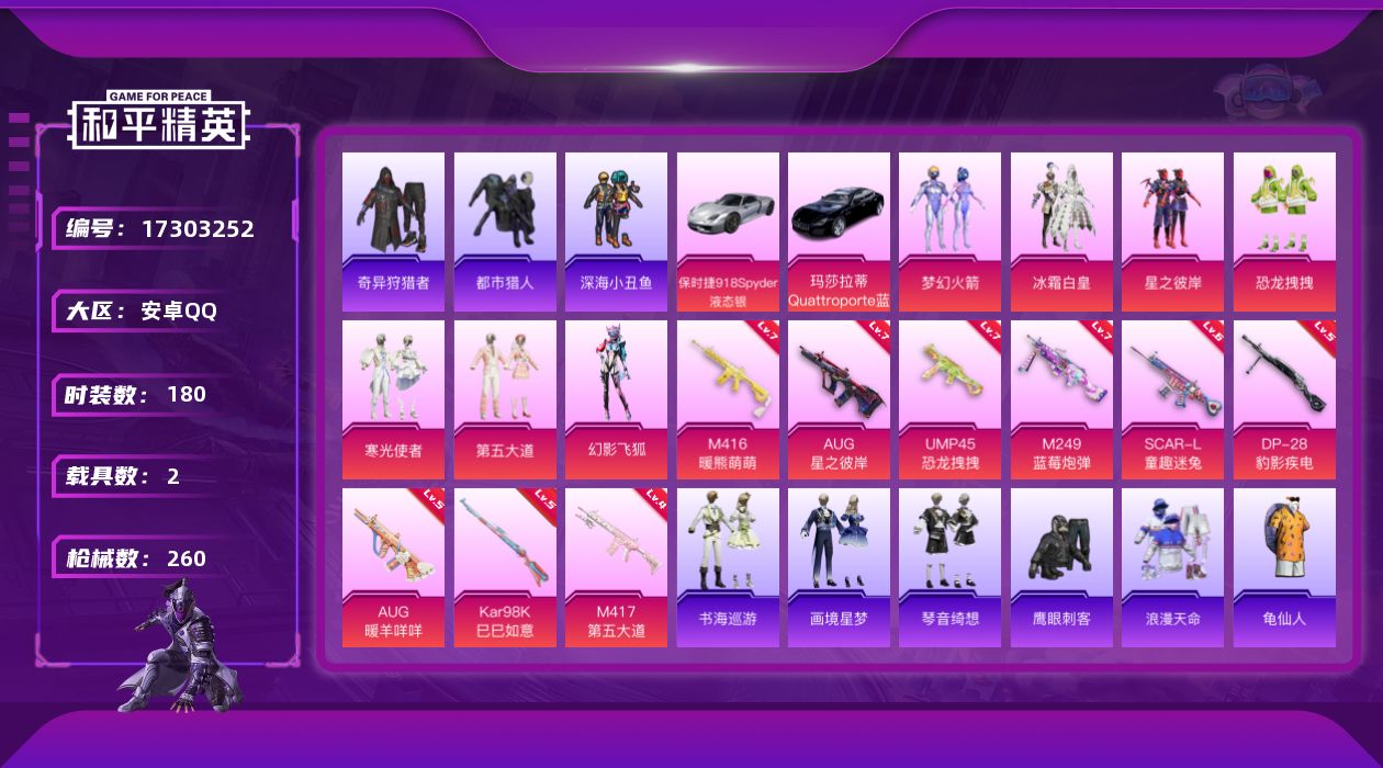 - [12810056]安卓 手Q-22粉装-6特效枪-4载具-3粉色飞行器-56643热力值-3王牌印记-108套装-117枪皮 【热门品类】:粉装-梦幻火箭,套装-小丑鱼 【粉色载具】:特斯拉Model 3(冷光银),兰博基尼Estoque(尊享铂),海龙奔腾,萌喵橘座,空客H135-蔚蓝之翼 【粉色套装】:粉装-深海曼妙,粉装-天使彩虹糖,粉装-梦幻火箭,粉装-极致幻想,粉装-炙焰红王,粉装-甜梦冰蝶,粉装-馨动时刻,粉装-蜜桃特工,粉装-蝶舞蔷薇,粉装-葫芦兄弟,粉装-暗夜玫瑰,粉装-林间仙鹿,粉装-彩虹鹿灵,粉装-山涧鹿灵,粉装-齐天大圣,角色-洛天依,粉装-红伞翩翩,粉装-黄伞悠悠,粉装-黑伞漫漫,粉装-海渊国主,粉装-蓝莓炮弹,粉装-绚金瑰梦 【粉色枪皮等级】:AKM-梦之光华(四级),M16A4-葫芦兄弟(二级),SCAR-L-机甲封神(四级),M416-五爪金龙(四级),Vector-红伞翩翩(三级),平底锅-林间仙鹿(二级) 【粉色枪皮】:AKM-梦之光华,M16A4-葫芦兄弟,SCAR-L-机甲封神,M416-五爪金龙,Vector-红伞翩翩,平底锅-林间仙鹿 【粉色飞行器】:枪炮玫瑰飞行器,齐天大圣飞行器,绚金瑰梦飞行器 【粉色降落伞】:深海曼妙降落伞,百万伏特降落伞,甜心宝贝降落伞,神秘黑猫降落伞,四圣焕新降落伞,夏日绵绵冰降落伞,枪炮玫瑰降落伞,葫芦兄弟降落伞,机甲封神降落伞,暗夜玫瑰降落伞,林间仙鹿降落伞,齐天大圣降落伞,洛神天依降落伞,红伞翩翩降落伞,海渊国主降落伞,蓝莓炮弹降落伞,绚金瑰梦降落伞,恐龙拽拽降落伞,彩虹甜喵降落伞 【稀有枪皮】:AKM-四圣焕新,AKM-彩虹符号,AKM-海渊国主,AKM-百万伏特,AKM-萌趣颜团子,AKM-虎虎生威,M16A4-幻世战舞者,SCAR-L-夏日绵绵冰,SCAR-L-暗夜玫瑰,SCAR-L-龙宫之主,M416-夜灯,M416-神秘黑猫,M416-葫芦兄弟,GROZA-异彩先驱,GROZA-林间仙鹿,GROZA-蓝莓炮弹,QBZ-洛神天依,QBZ-神秘黑猫,QBZ-绚金瑰梦,M762-彩虹甜喵,M762-枪炮玫瑰,M762-深海曼妙,M762-烈焰拳霸,M762-瑞龙福将,M762-甜心宝贝,M762-绯红前夜,Mk47-林间仙鹿,Mk47-洛神天依,Mk47-百万伏特,G36C-时空追击者,G36C-暗夜玫瑰